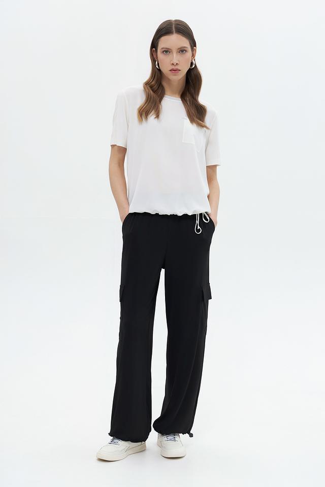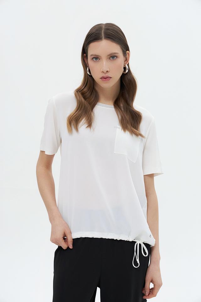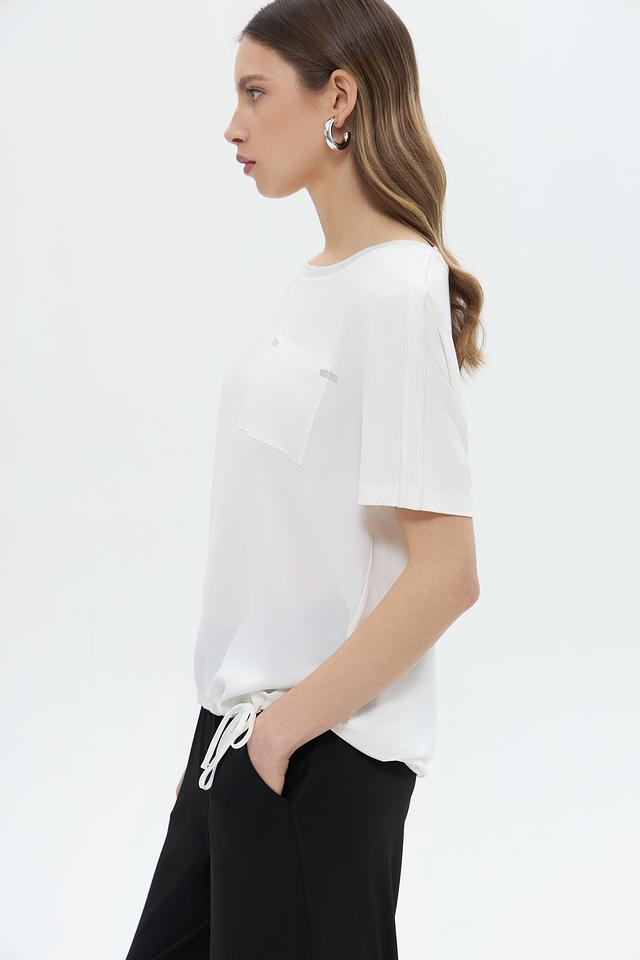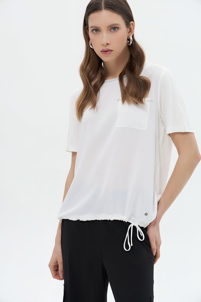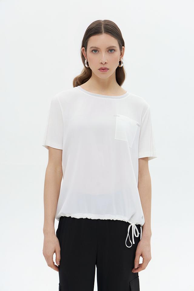 Белая блуза Monari из 100% полиэстера – это лёгкая и воздушная модель с короткими рукавами и накладным карманом. Блуза дополнена сборкой и завязками по низу, что придает ей оригинальный вид. Состав: полиэстер 100%