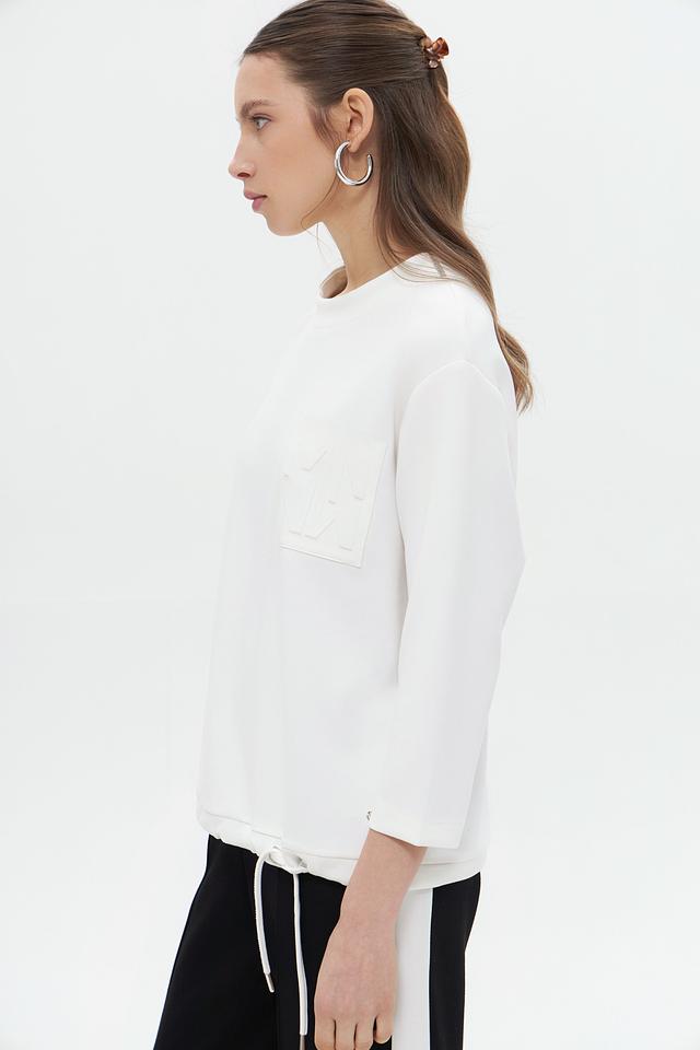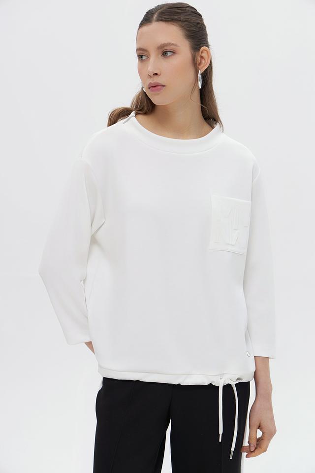 Особенностью модели является кулиска по низу изделия, позволяющая регулировать силуэт и создавать различные образы. Пуловер выполнен в белом цвете, который легко сочетается с другими элементами гардероба. Это отличный выбор для повседневной носки и создания стильных образов.