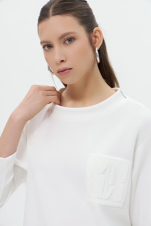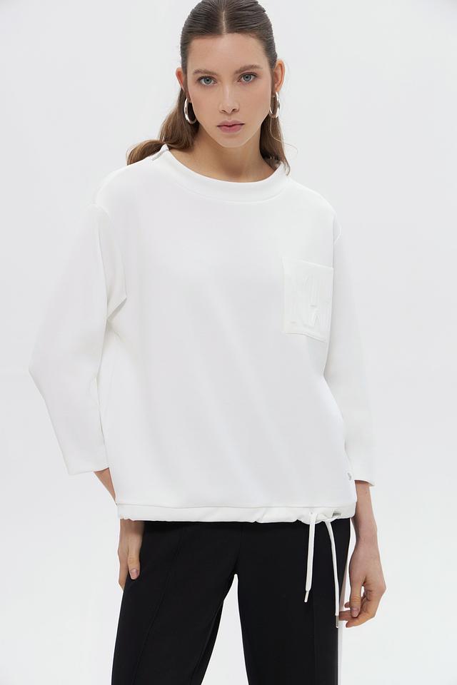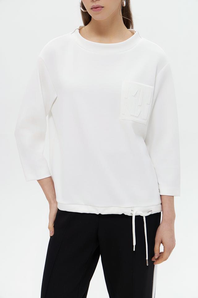 Белый пуловер Monari из мягкого модала с полиэстером и эластаном. Модель имеет удобный крой с рукавом 3/4, карманом на груди и кулиской по низу. Идеальный выбор для создания комфортного и стильного образа. Состав: модал 52%, полиэстер 42%, эластан 6%