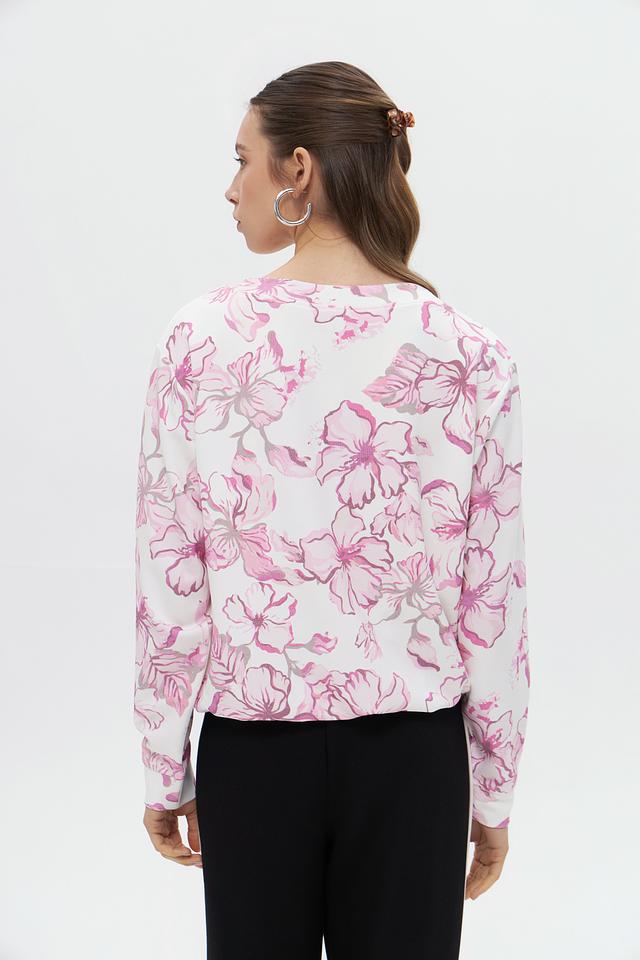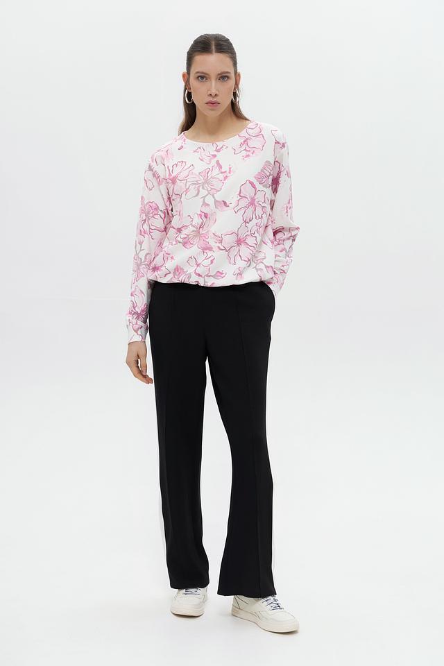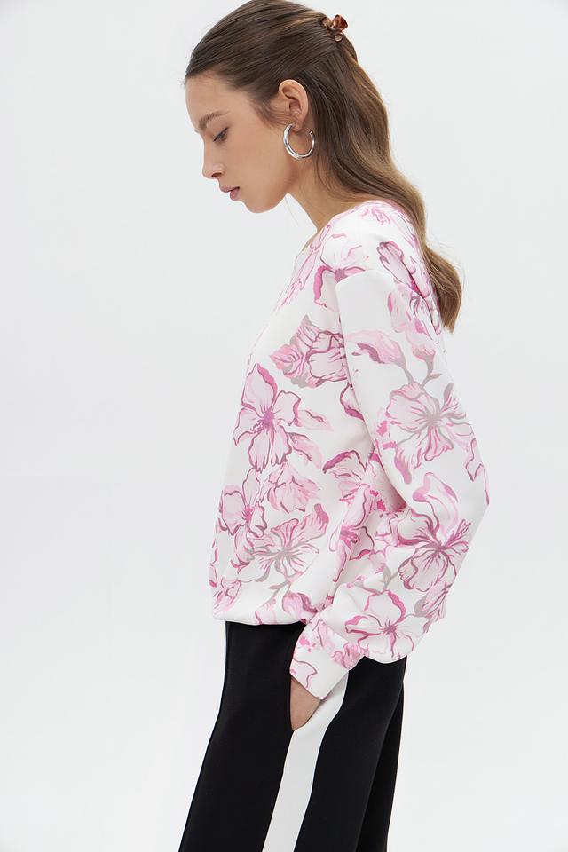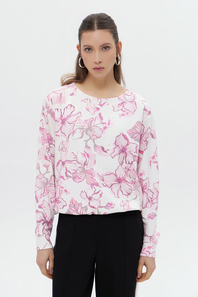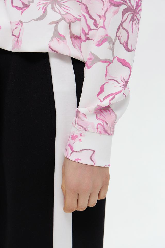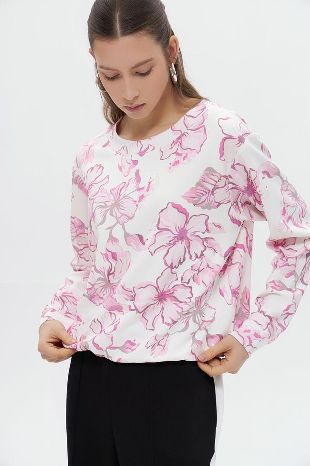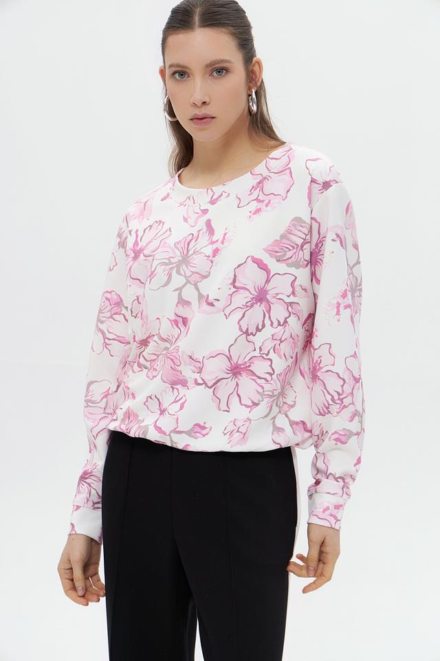 Этот стильный пуловер от Monari выполнен в нежно-розовой цветовой гамме и украшен ярким цветочным принтом. Модель имеет круглый вырез горловины и длинные рукава, что делает ее универсальной для различных образов.