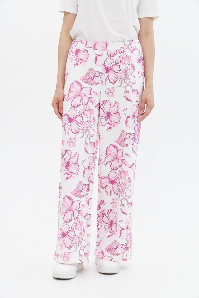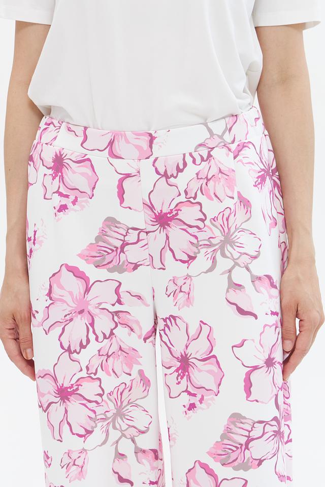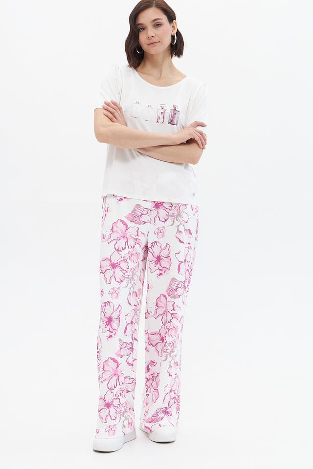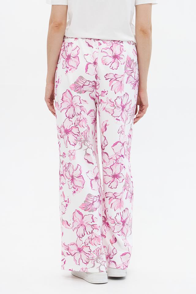 Брюки имеют прямой крой и классическую посадку на талии. Основной цвет – белый, украшен эффектным цветочным принтом в розовых тонах. Такой рисунок придаёт образу свежесть и лёгкость.