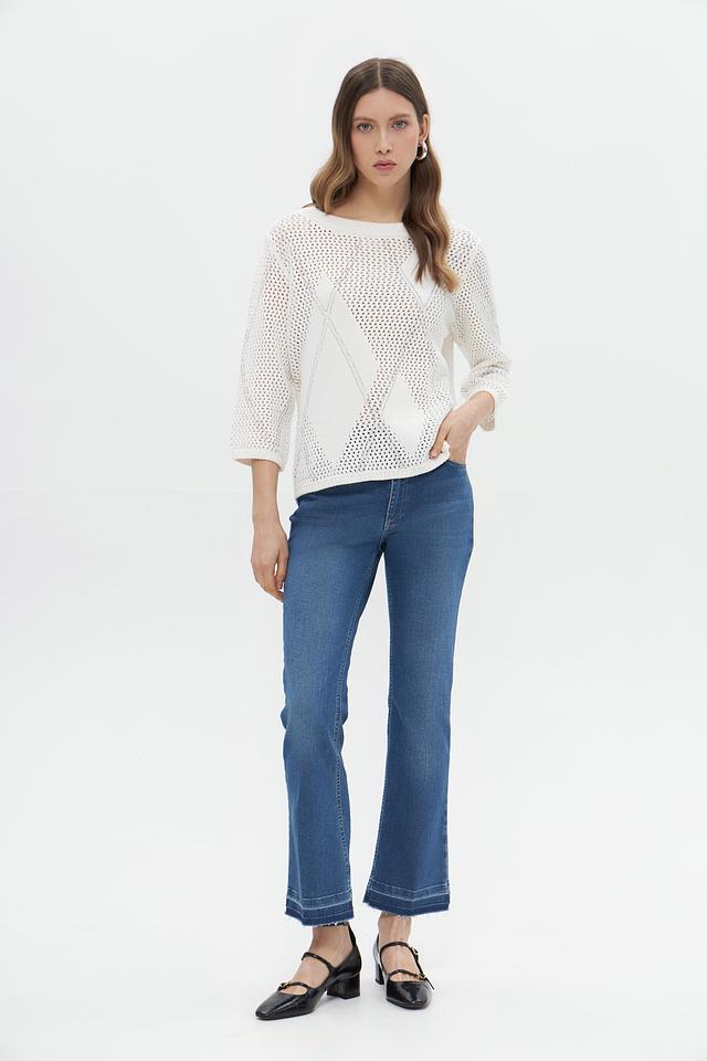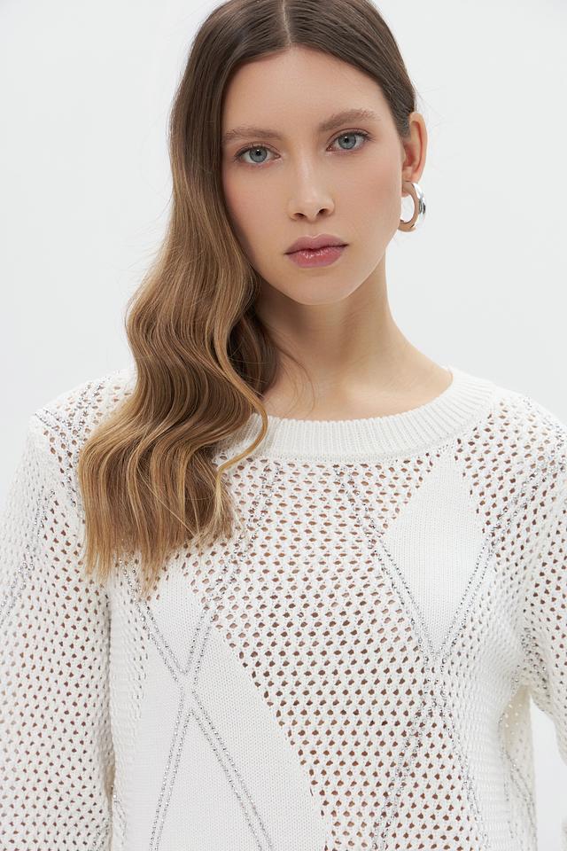 Модель отличается ажурным дизайном с геометрическим узором, который придаёт ей изысканность и лёгкость. Пуловер имеет круглый вырез горловины и короткий рукав, что делает его идеальным выбором для тёплой погоды.