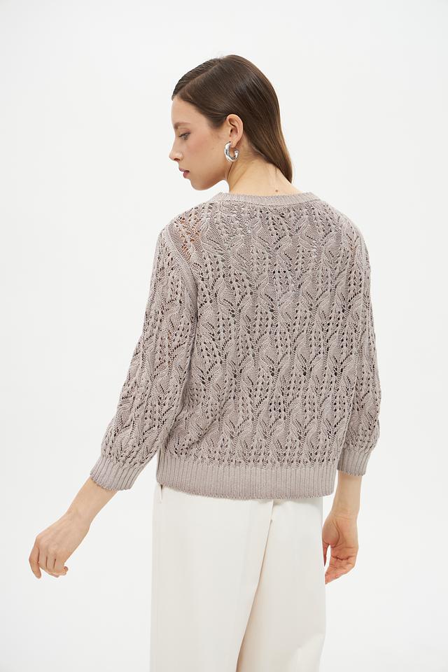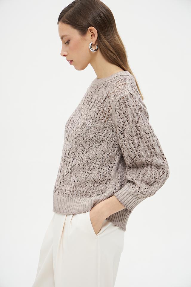 Светло-бежевый пуловер Monari из льна и хлопка с ажурным узором станет отличным дополнением к вашему гардеробу. Модель имеет округлый вырез горловины и рукава 3/4, что делает ее универсальной для создания различных образов. Состав: лен 63%, хлопок 37%