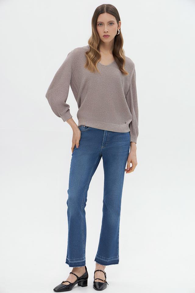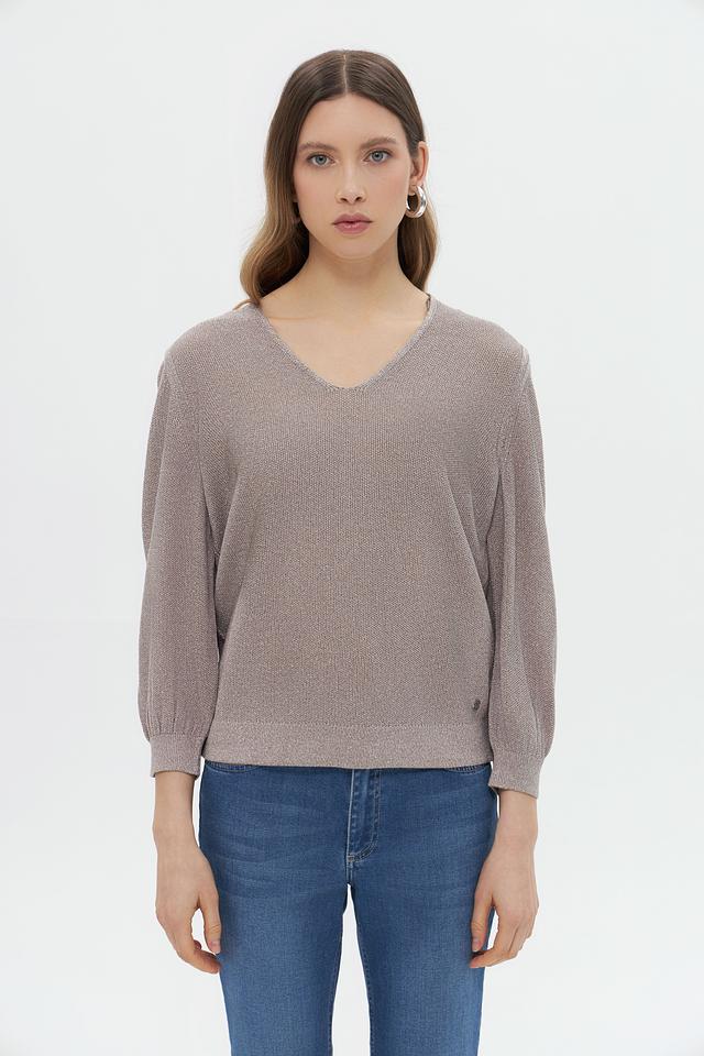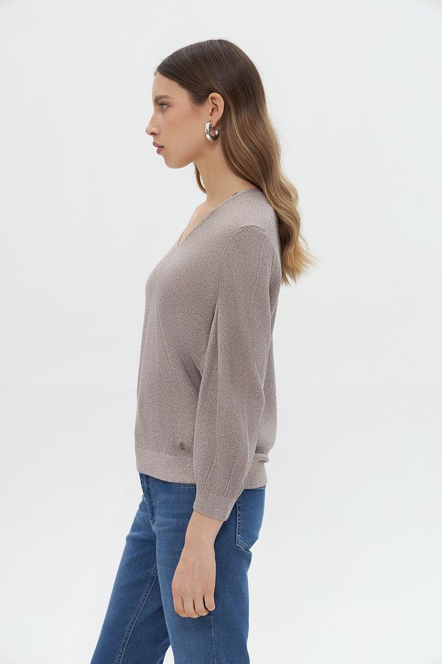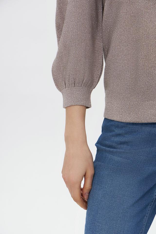 Бежевый пуловер от Monari с рукавом-фонарик и V-образным вырезом. Изготовлен из мягкой вискозы с добавлением полиэстера и полиакрила, что придает ему приятную текстуру и комфорт в носке. Состав: вискоза 48%, полиакрил 24%, полиэстер 21%, метализ.полиэстер 7%