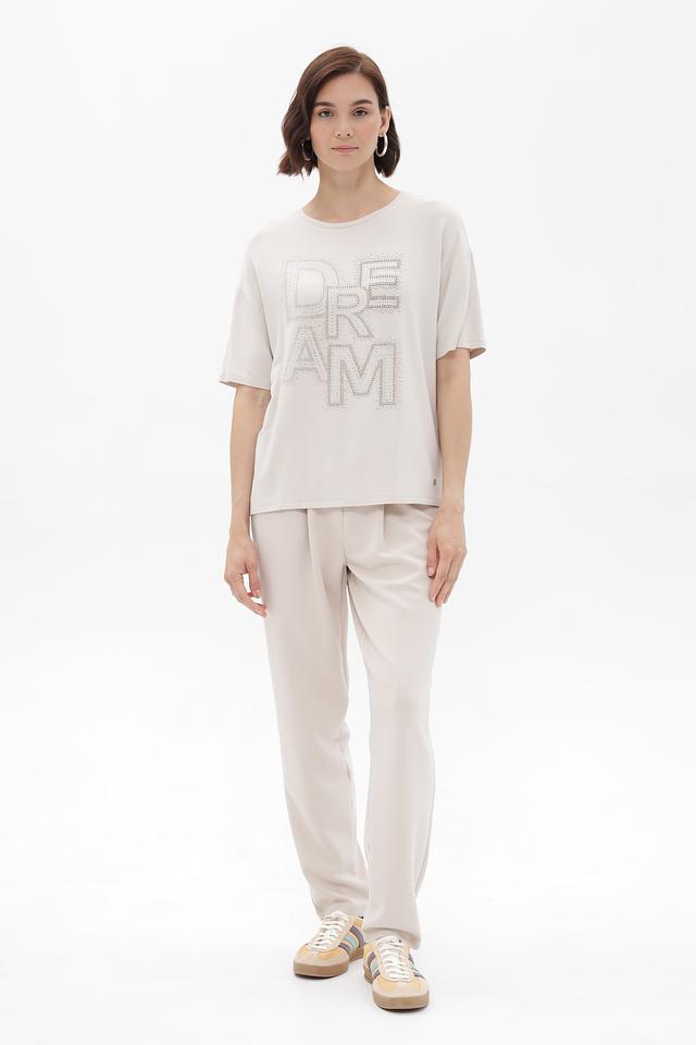 Бежевая футболка Monari с декоративной надписью “DREAM”, выполненная из мягкого трикотажа. Состав включает вискозу, модал и эластан для комфорта и хорошей посадки. Состав: вискоза 45%, модал 45%, эластан 10%