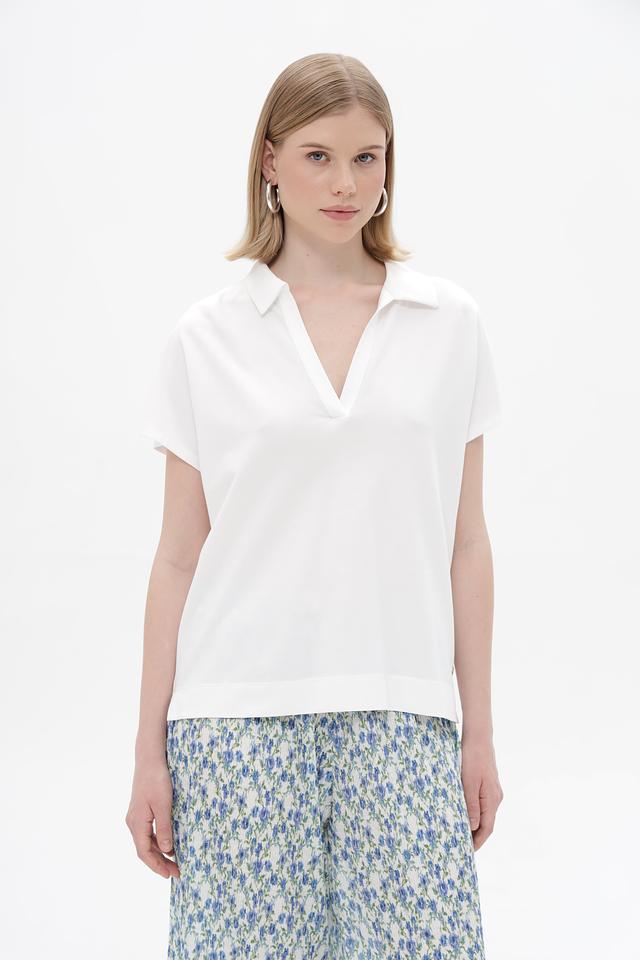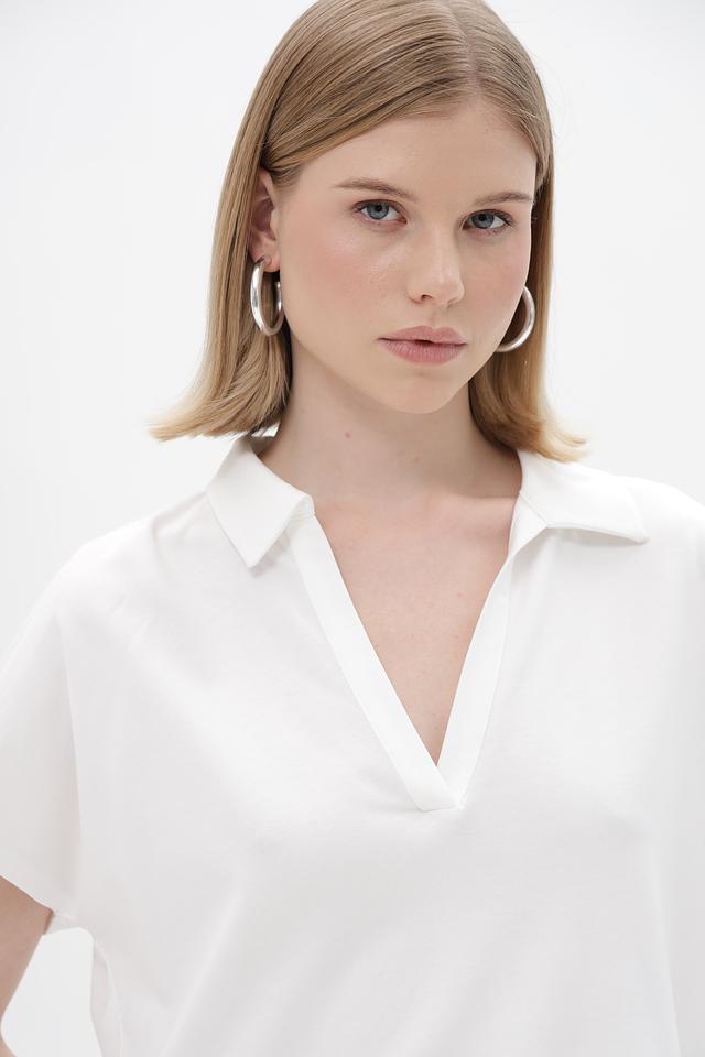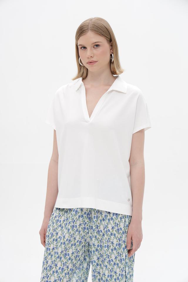 Модель имеет классический крой с короткими рукавами и V-образным вырезом, обрамленным воротником-поло. Прямой силуэт не сковывает движений, а лаконичный дизайн позволяет сочетать эту футболку с различными элементами одежды – от джинсов и брюк до юбок и шорт.