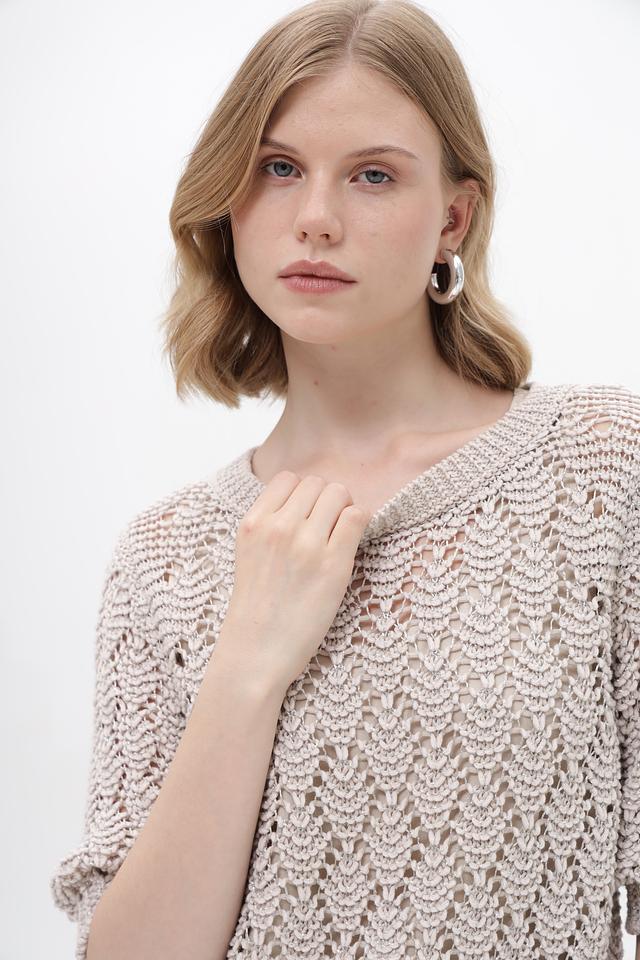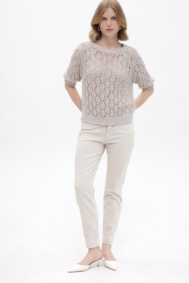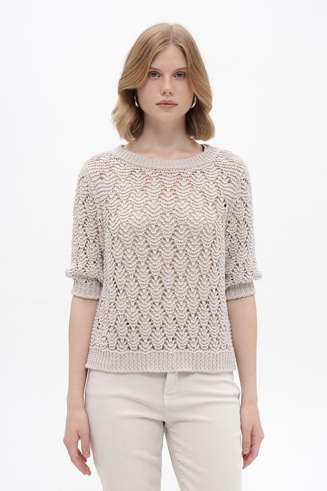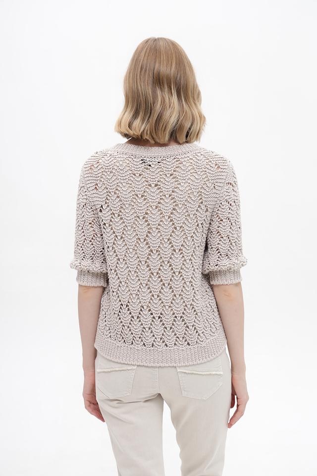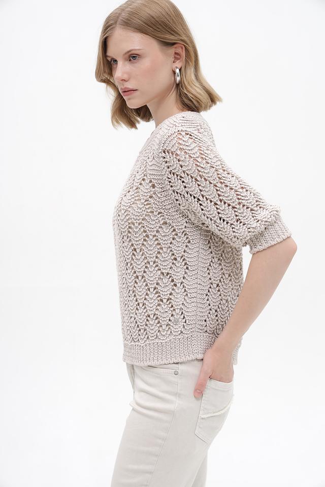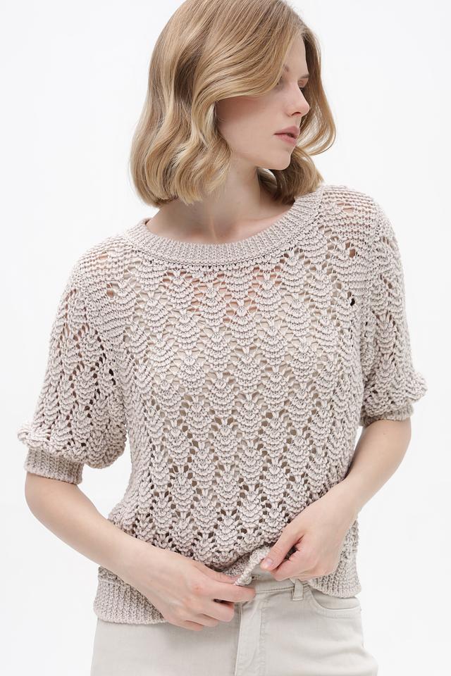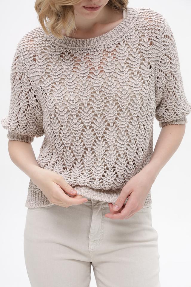Пуловер изготовлен из сочетания хлопка, полиакрила, полиэстера и метализированного полиэстера, что обеспечивает комфорт в носке и лёгкий уход. Ажурный узор придаёт изделию воздушность и лёгкость, а также позволяет создать интересный образ с многослойностью.