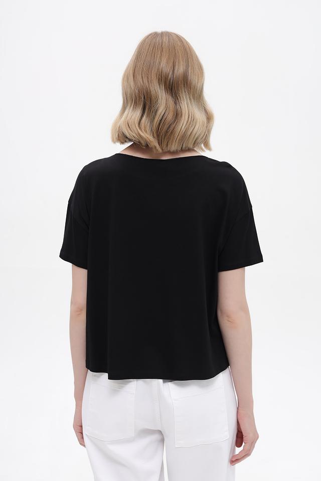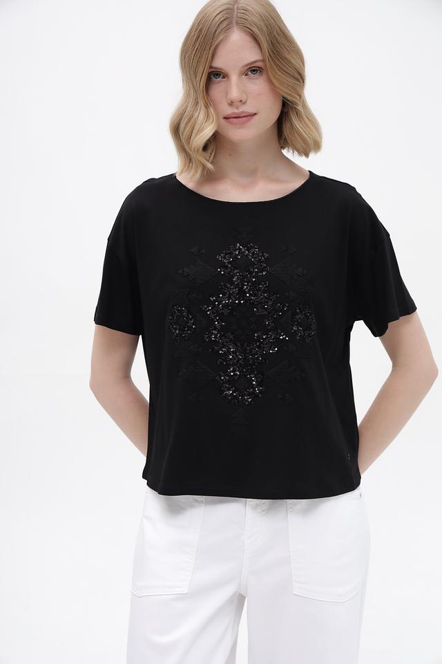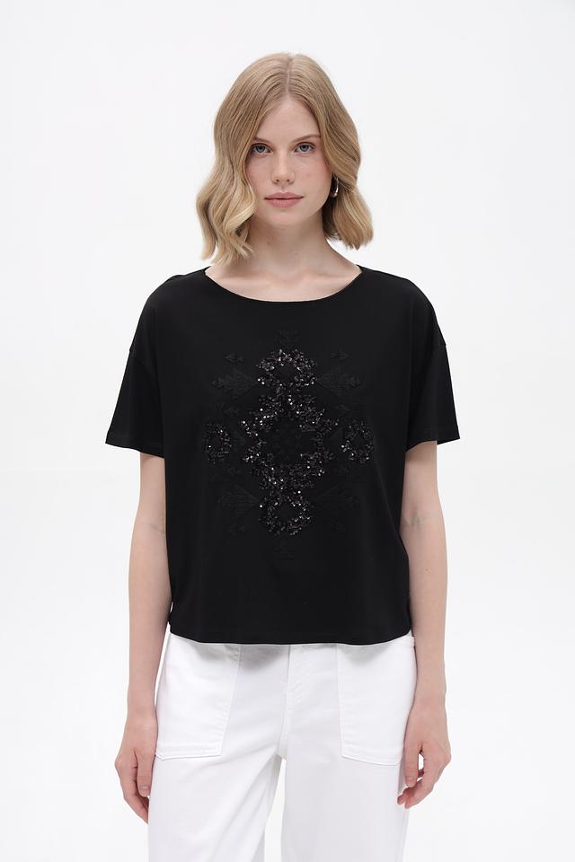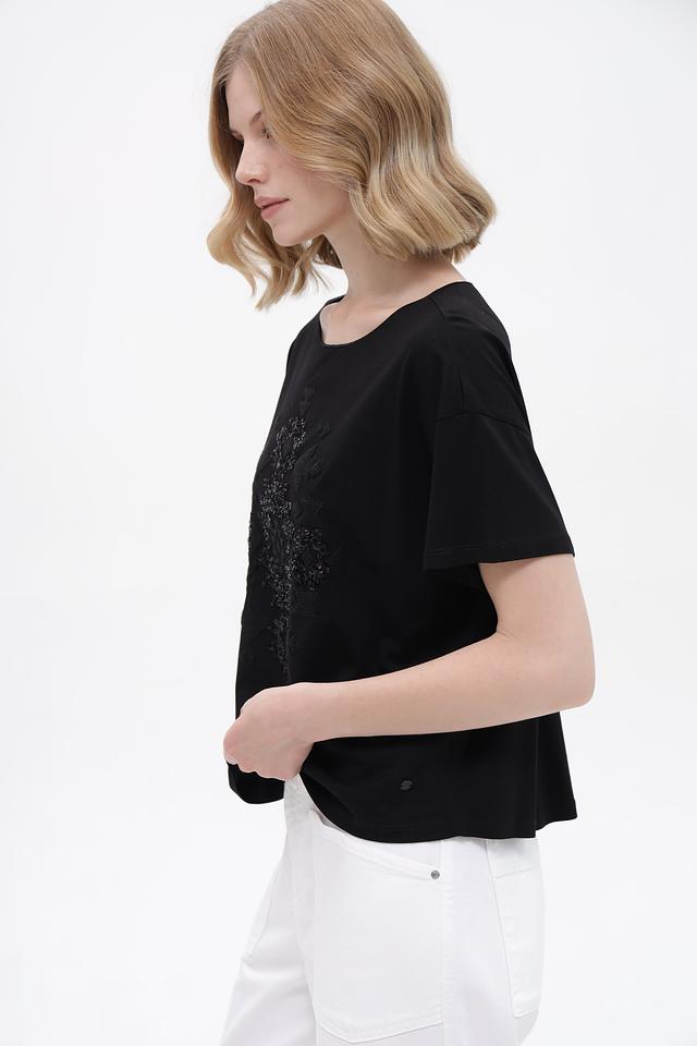 Чёрная футболка Monari с оригинальным декором из пайеток. Модель свободного кроя с короткими рукавами выполнена из мягкого хлопка с модалом, обеспечивающего комфорт в носке. Состав: хлопок 50%, модал 50%