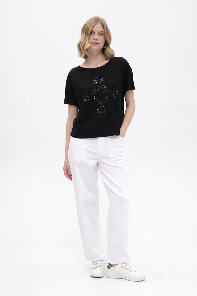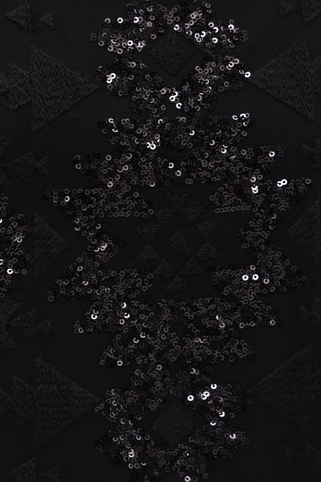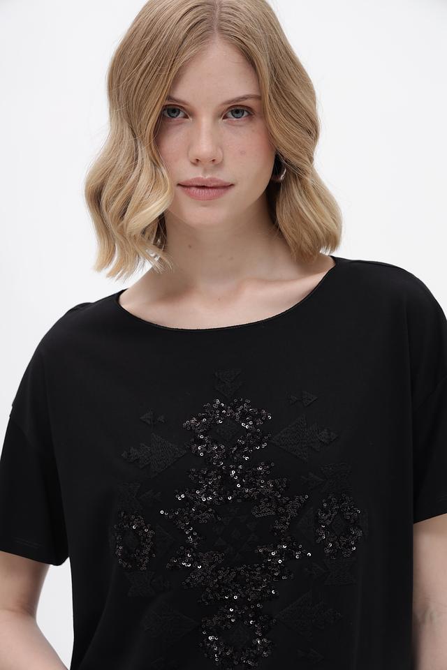 Основной цвет футболки – чёрный, который подчеркивает элегантность и универсальность модели. Главной особенностью является эффектный декор в виде узора из пайеток, расположенного на передней части изделия. Этот декор придает футболке праздничный и нарядный вид.