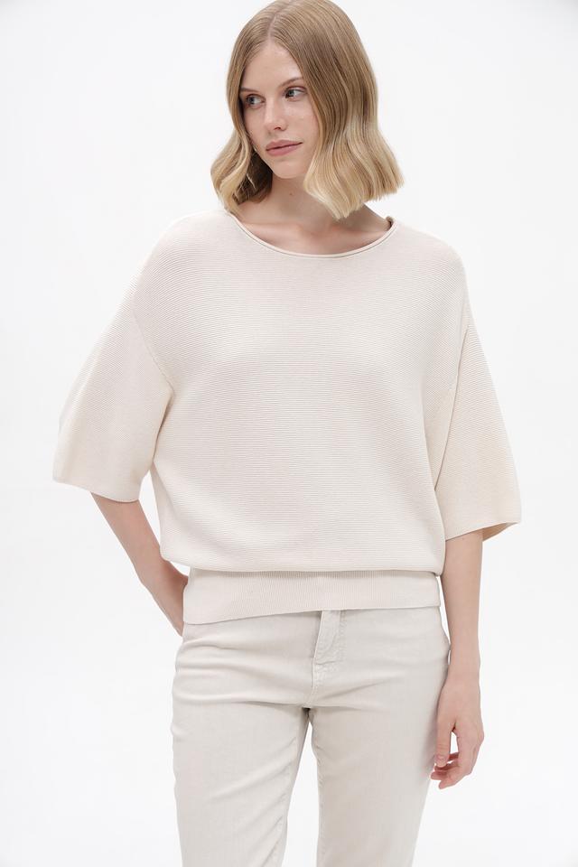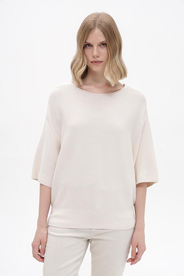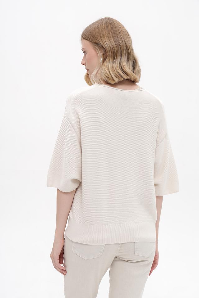 Бежевый пуловер Monari из 100% хлопка с рукавом 3/4. Модель выполнена фактурной вязкой и имеет свободный крой. Идеальный выбор для создания комфортных и стильных образов. Состав: хлопок 100%