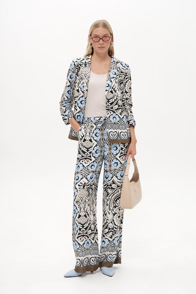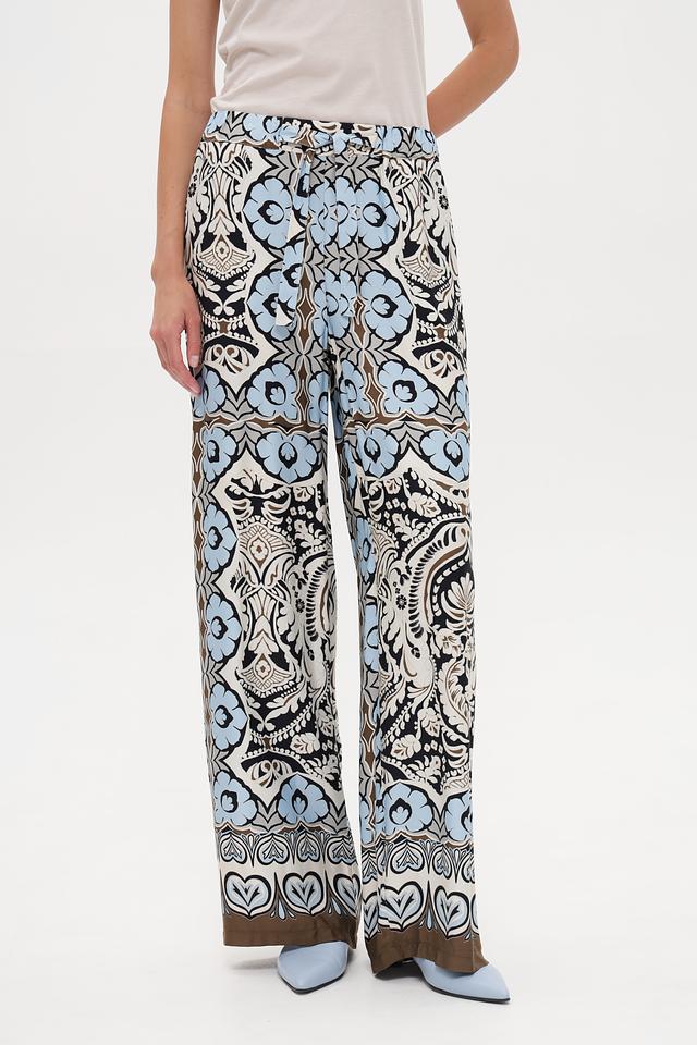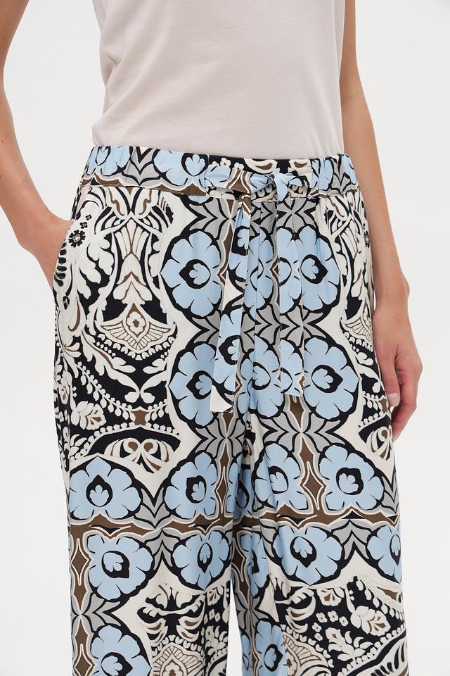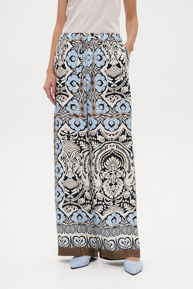 Особое внимание привлекает яркий цветочный принт, выполненный в сочетании голубого, белого, коричневого и чёрного цветов. Такой рисунок добавит вашему образу оригинальности и неповторимости. Брюки легко сочетаются с различными топами и обувью, позволяя создавать разнообразные стильные комплекты.