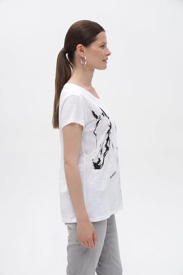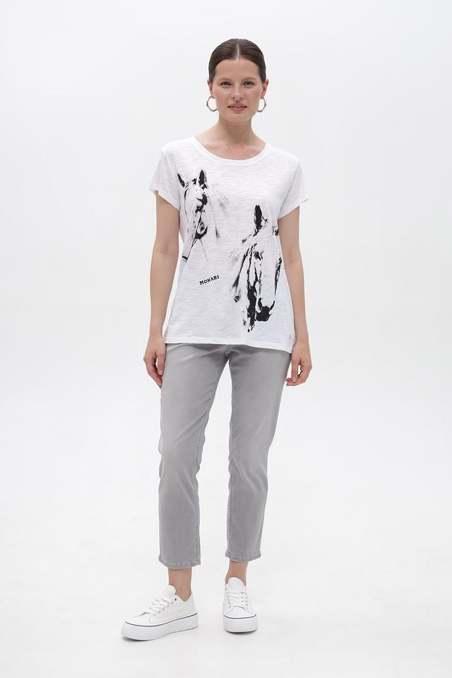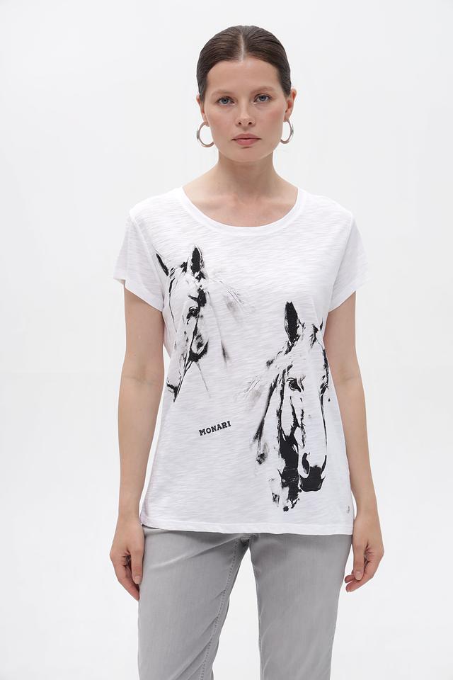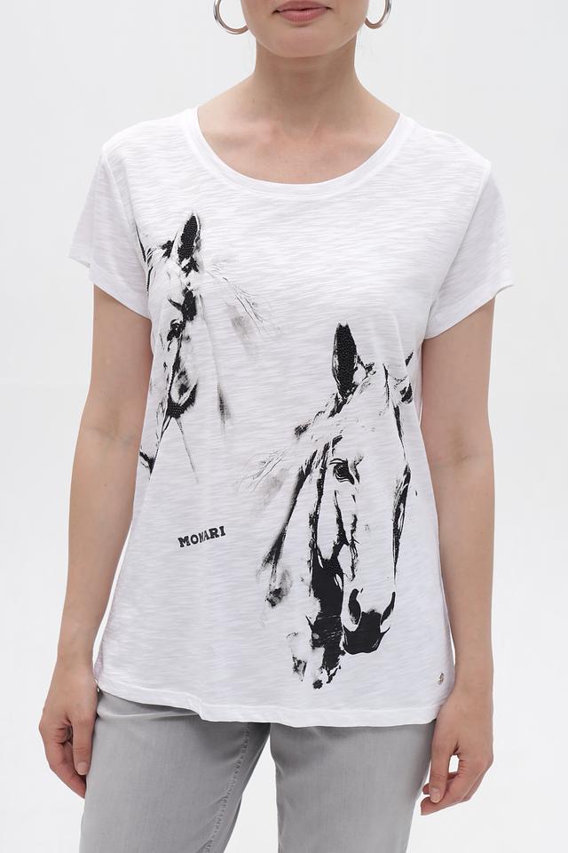 Белая футболка Monari с оригинальным принтом лошадей – стильное и комфортное решение для повседневного образа. Изготовлена из мягкого хлопка с модалом, обеспечивающего приятные ощущения на коже. Состав: хлопок 50%, модал 50%