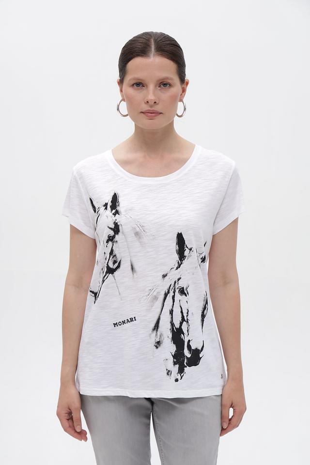 Эта футболка от Monari станет ярким акцентом в вашем гардеробе. Выполнена в белом цвете и украшена эффектным принтом с изображением лошадей, придающим ей неповторимый характер.