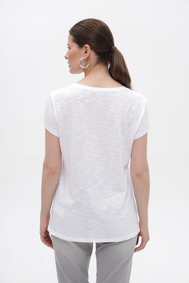 Модель имеет прямой крой, который обеспечивает свободу движений и комфортную посадку по фигуре. Круглый вырез горловины и короткие рукава делают футболку идеальной для теплой погоды.
