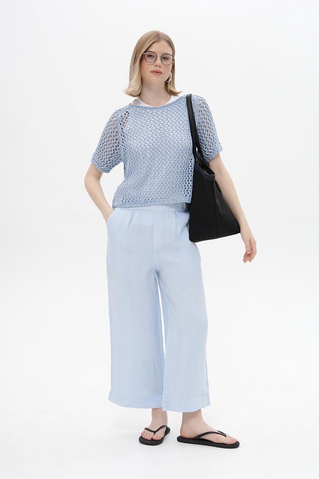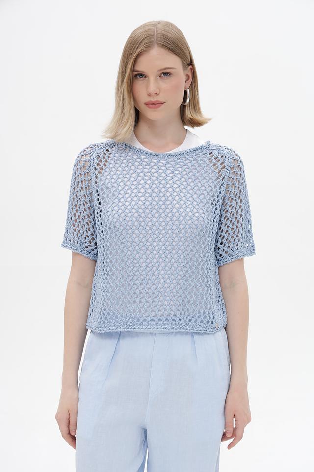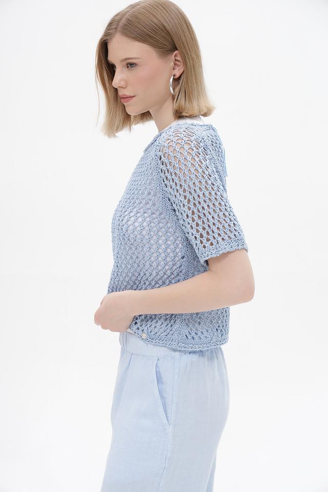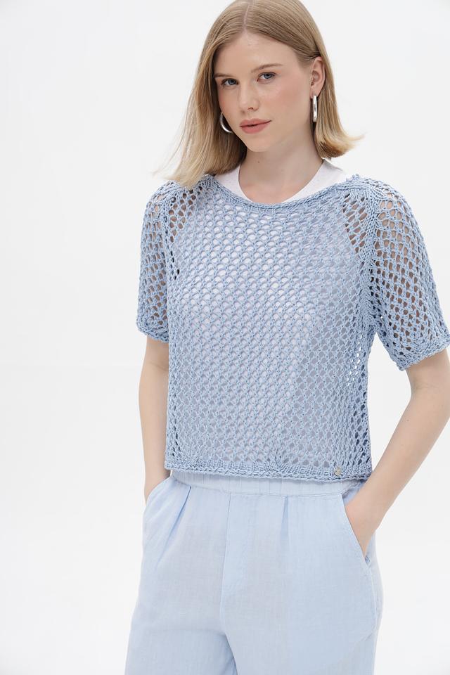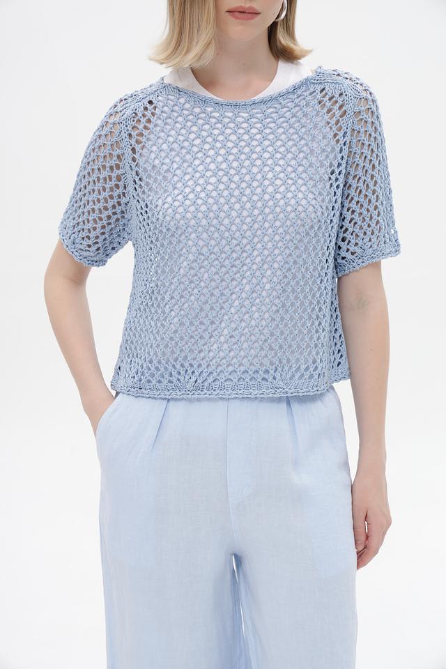 Женский пуловер от бренда Monari выполнен в светло-голубом цвете. Модель имеет короткие рукава и укороченный крой, что делает ее идеальным выбором для теплых дней.