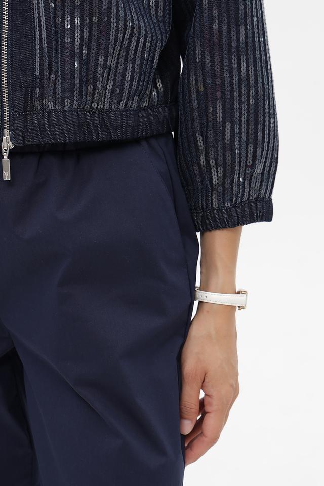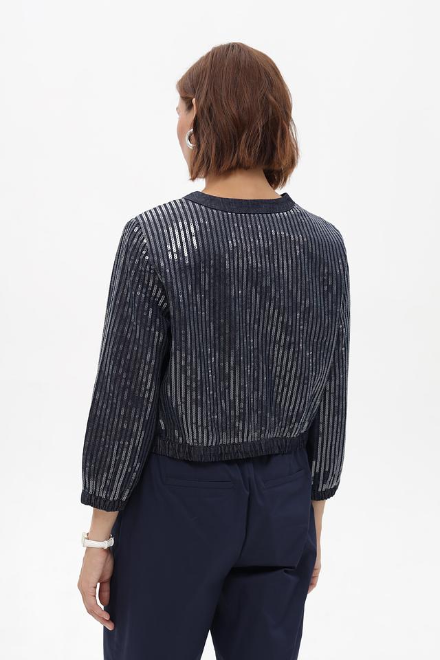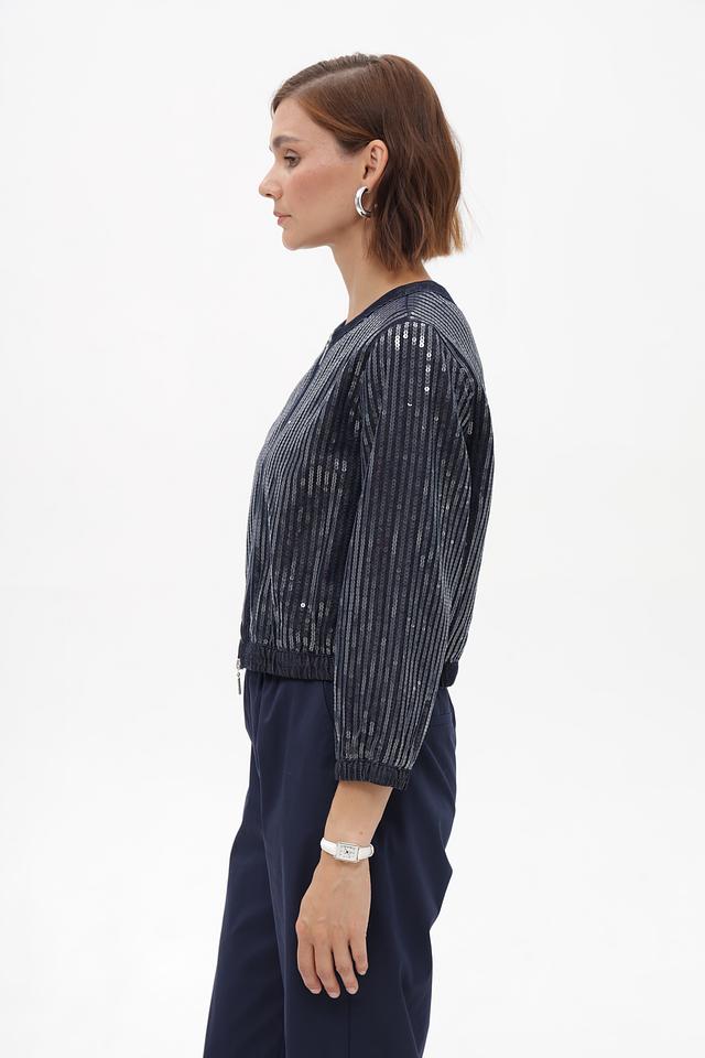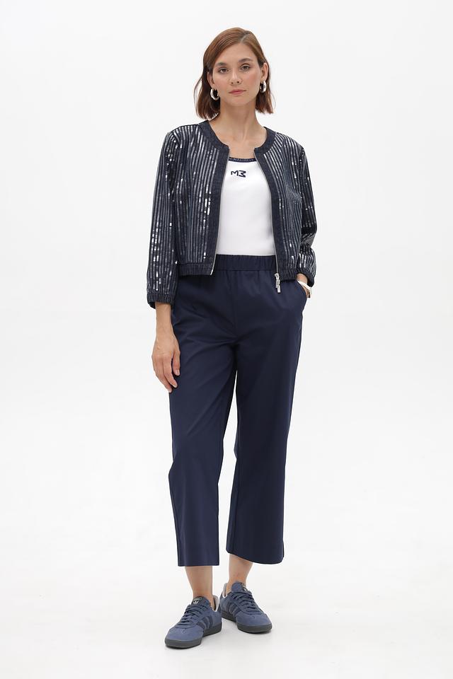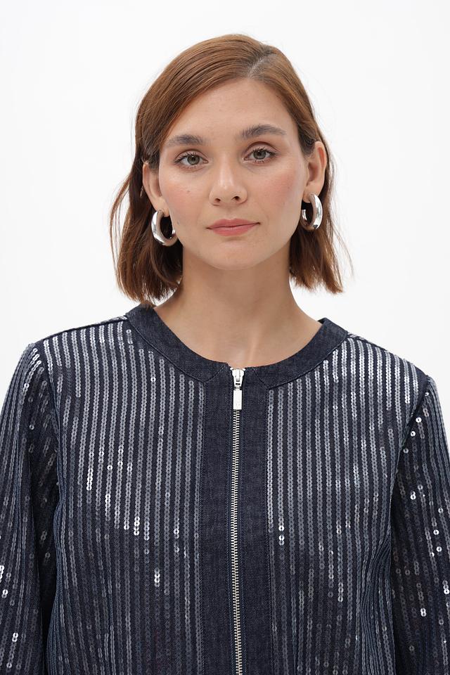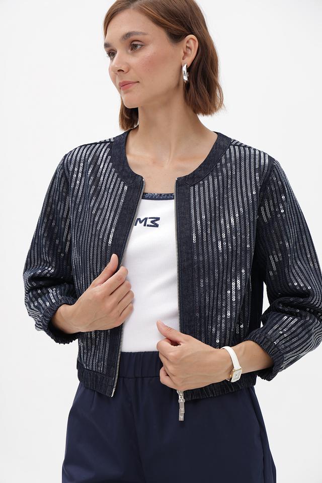 Этот стильный жакет от Monari выполнен в темно-синем цвете и украшен вертикальными полосками, добавляющими динамики образу. Жакет имеет укороченный крой и застегивается на молнию.