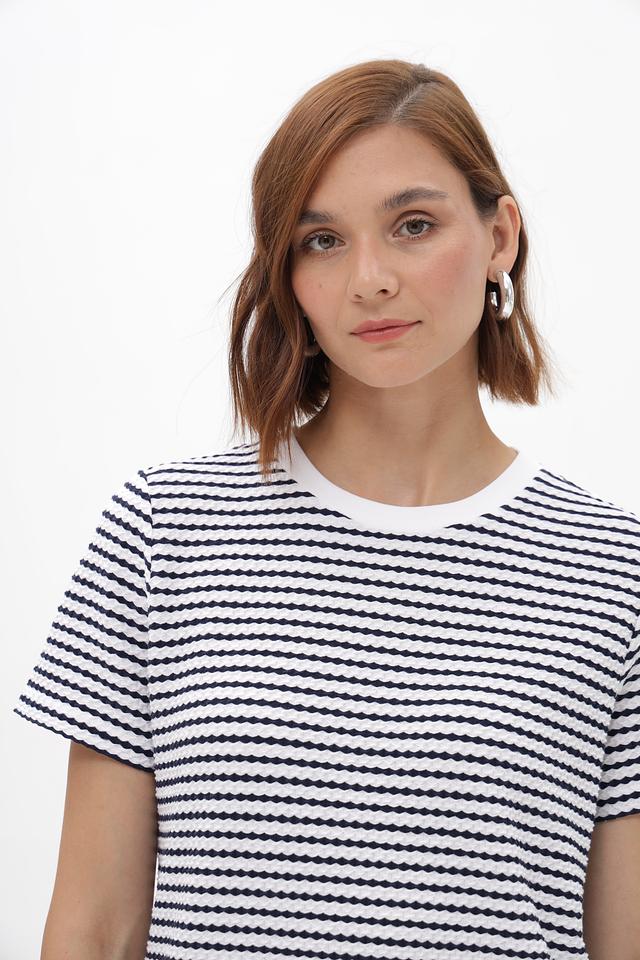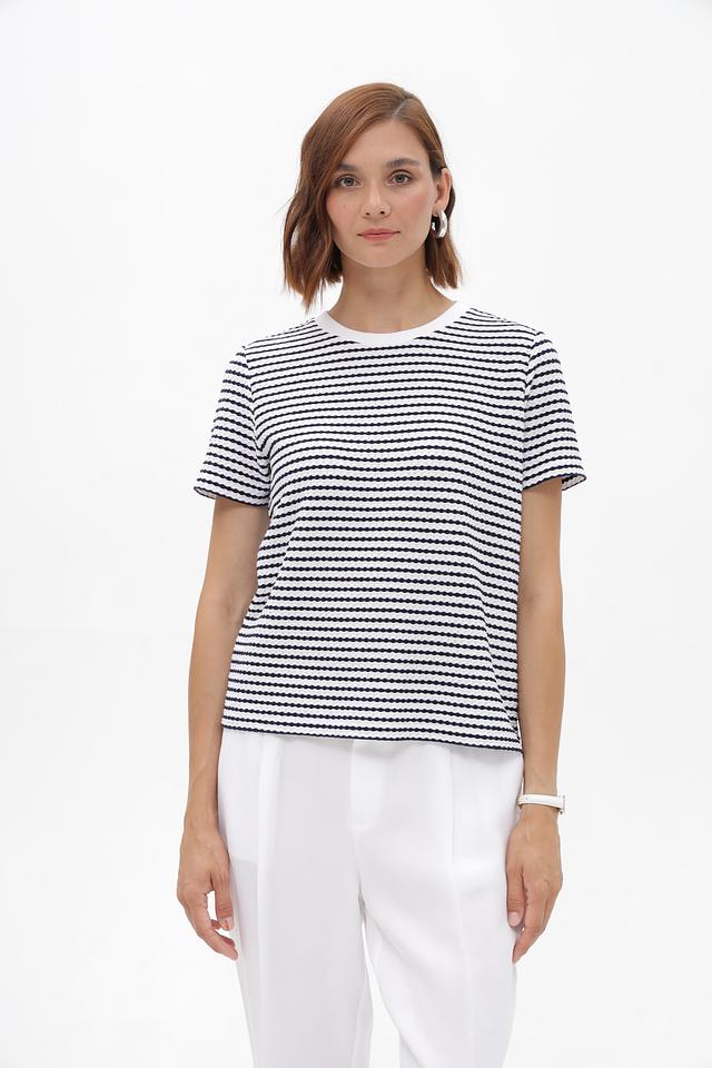 Женская футболка Monari выполнена в классическую бело-синюю полоску. Модель с коротким рукавом и круглым вырезом станет отличным дополнением к вашему образу. Изготовлена из приятной к телу ткани. Состав: полиэстер 66%, вискоза 30%, эластан 4%