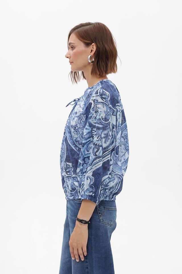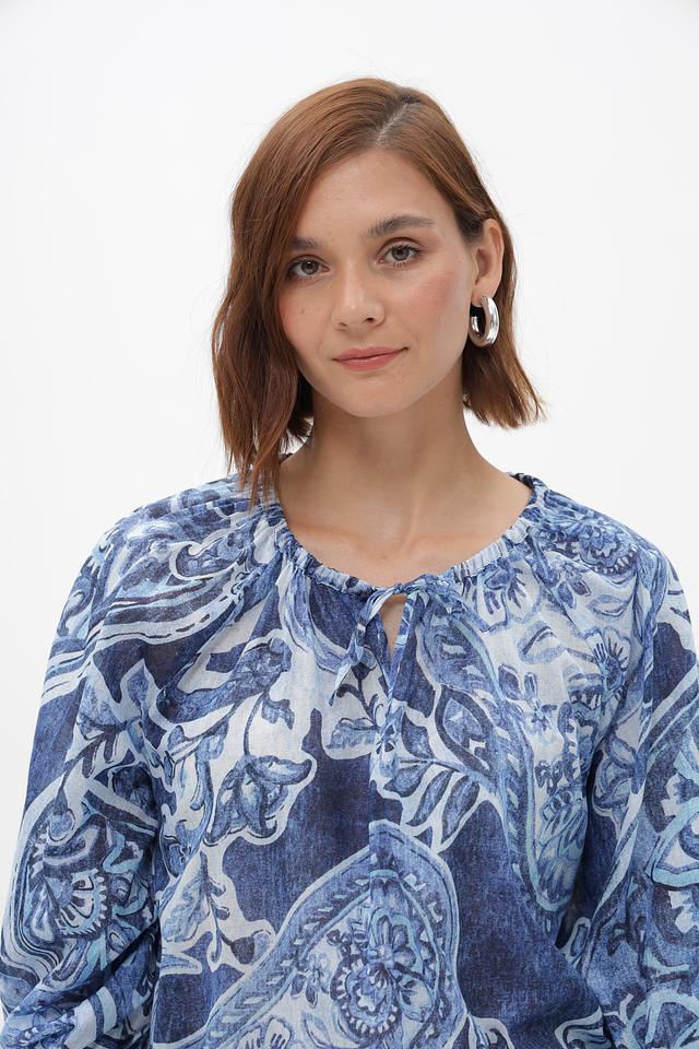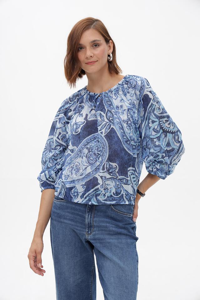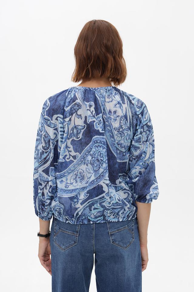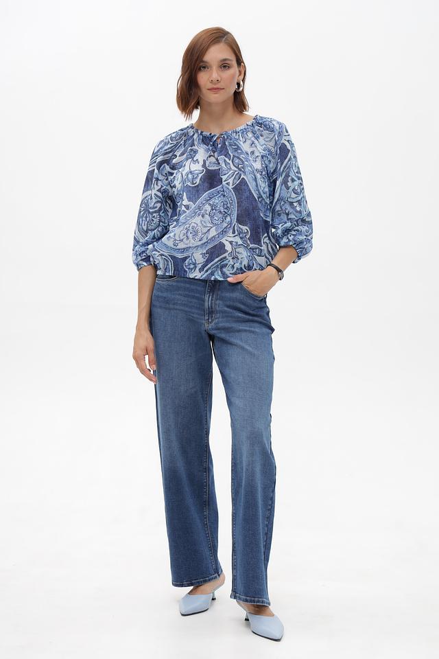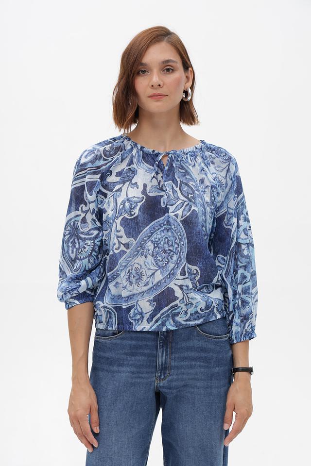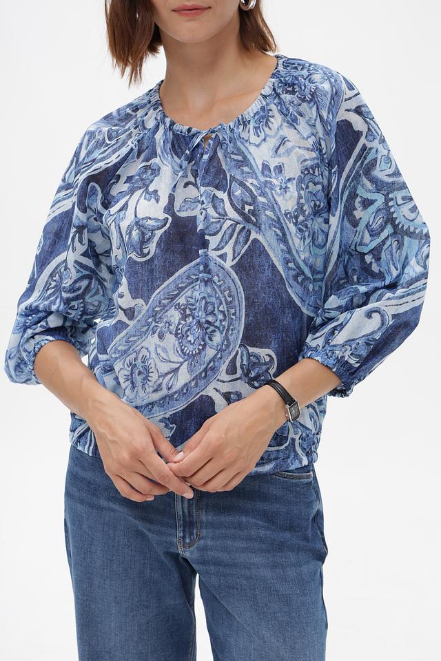 Блуза имеет яркий и запоминающийся принт пейсли в синих тонах, который придает ей особый шарм. Округлый вырез горловины дополнен небольшим разрезом, что добавляет образу легкости и непринужденности.