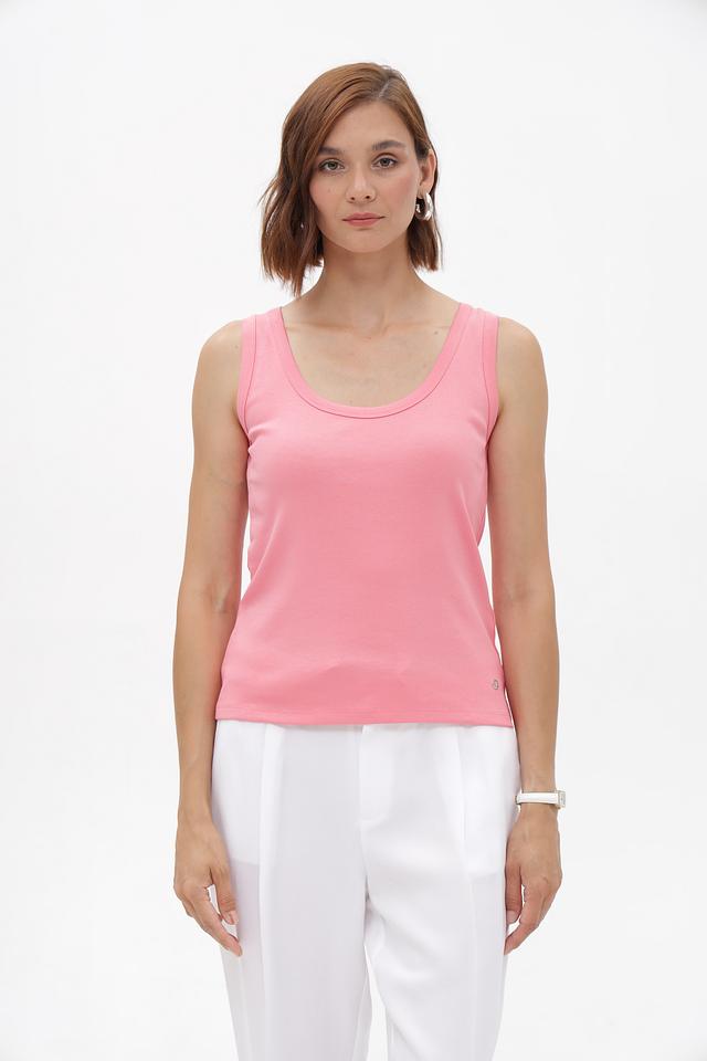Нежный розовый оттенок топа добавит женственности и легкости вашему образу. Удобный и практичный, этот топ станет отличным выбором для повседневной носки. Состав: 94% хлопок, 6% эластан.