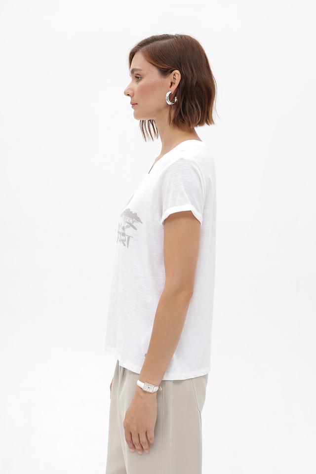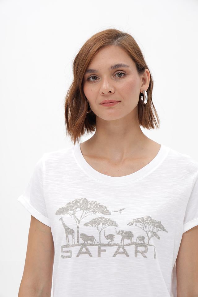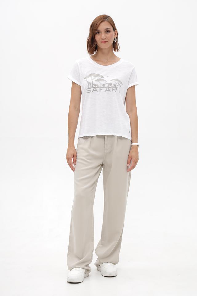 Белая футболка Monari с принтом «Safari» — стильная базовая вещь на каждый день. Изготовлена из мягкого хлопка с модалом для комфорта и приятных ощущений. Идеально сочетается с джинсами и брюками. Состав: хлопок 50%, модал 50%