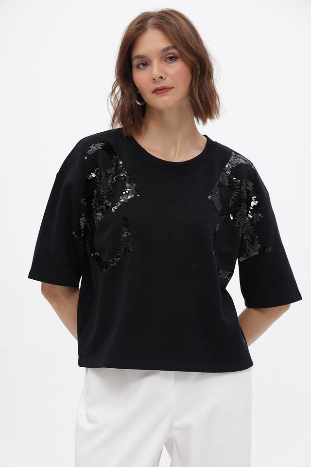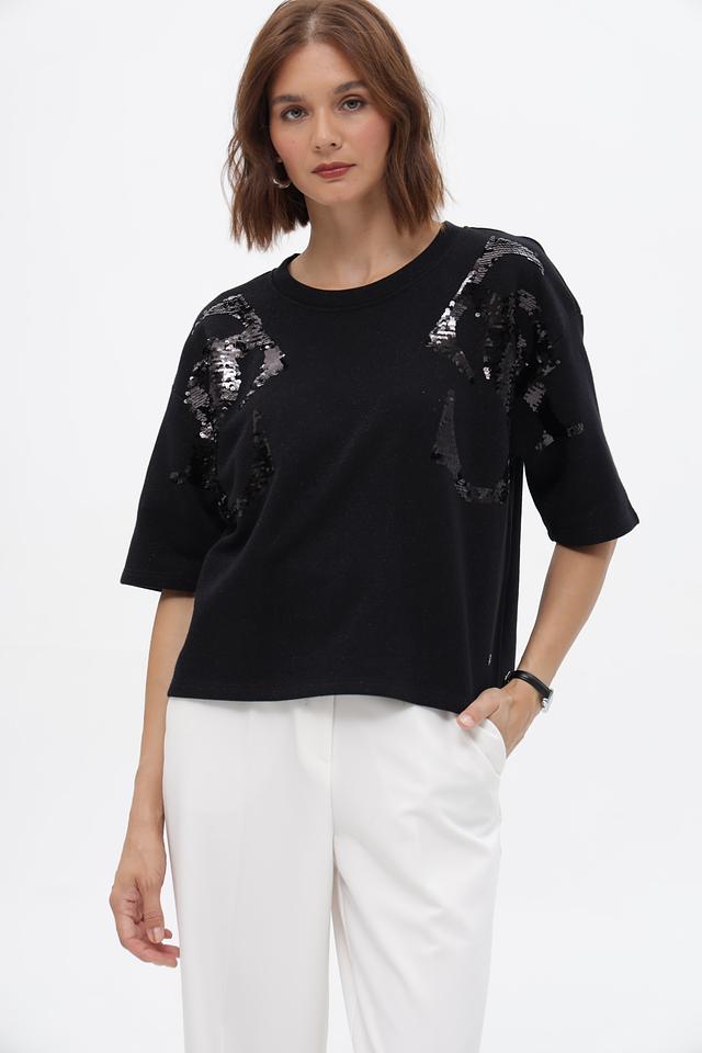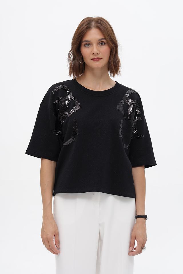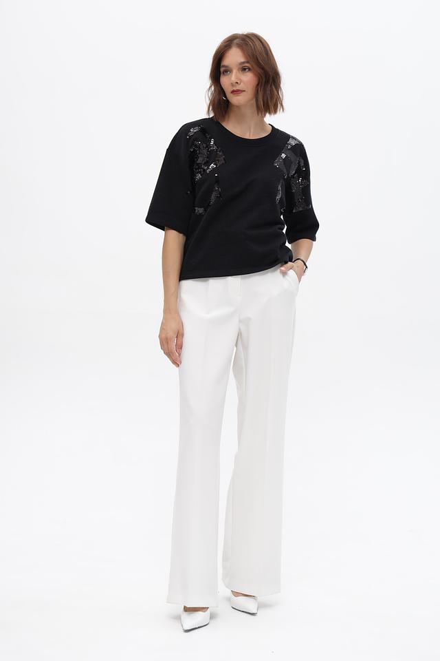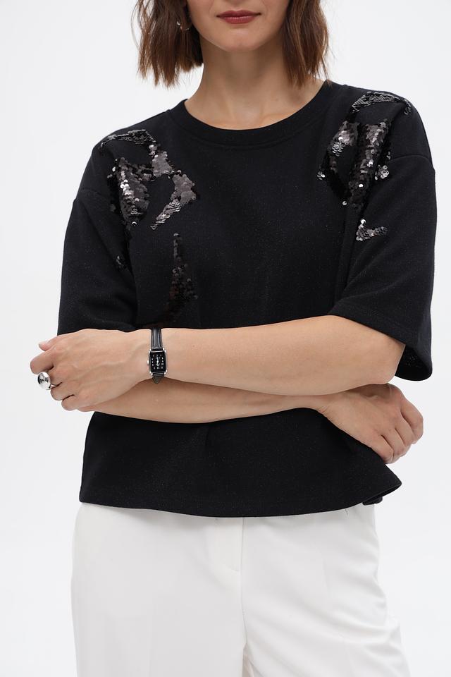 Чёрный пуловер от Monari с эффектными пайетками станет ярким акцентом вашего образа. Модель свободного кроя с короткими рукавами выполнена из мягкого хлопка с добавлением металлизированной нити. Состав: хлопок 85%, метализ.нить 15%