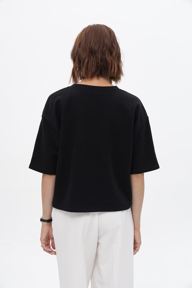 Пуловер имеет свободный крой, который обеспечивает комфорт и свободу движений. Короткие рукава делают его идеальным для тёплой погоды или для создания многослойных образов. Материал – мягкий хлопок с добавлением металлизированной нити, что обеспечивает приятные тактильные ощущения и лёгкий блеск.