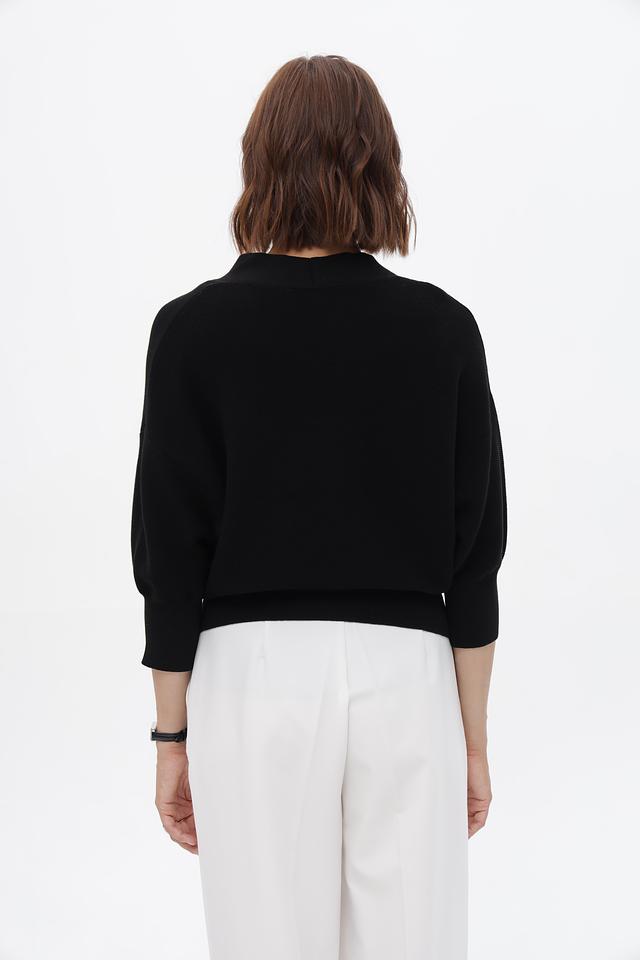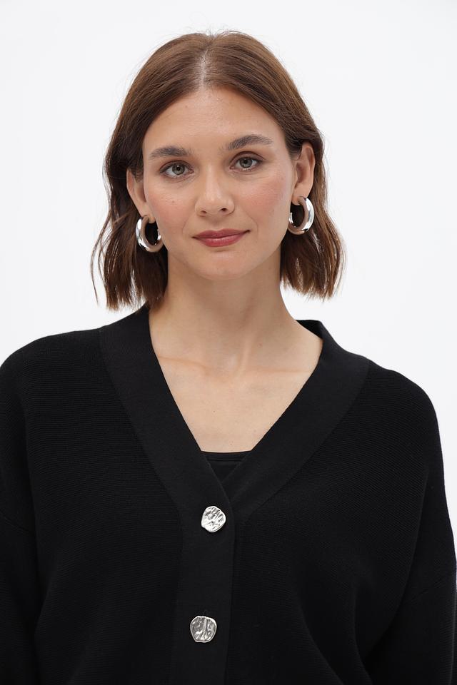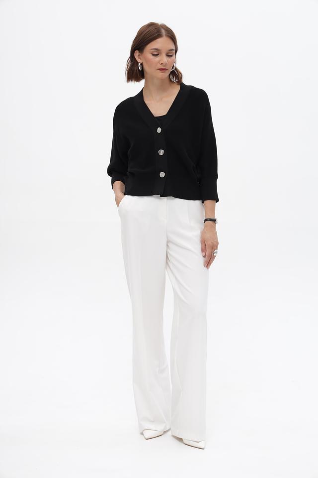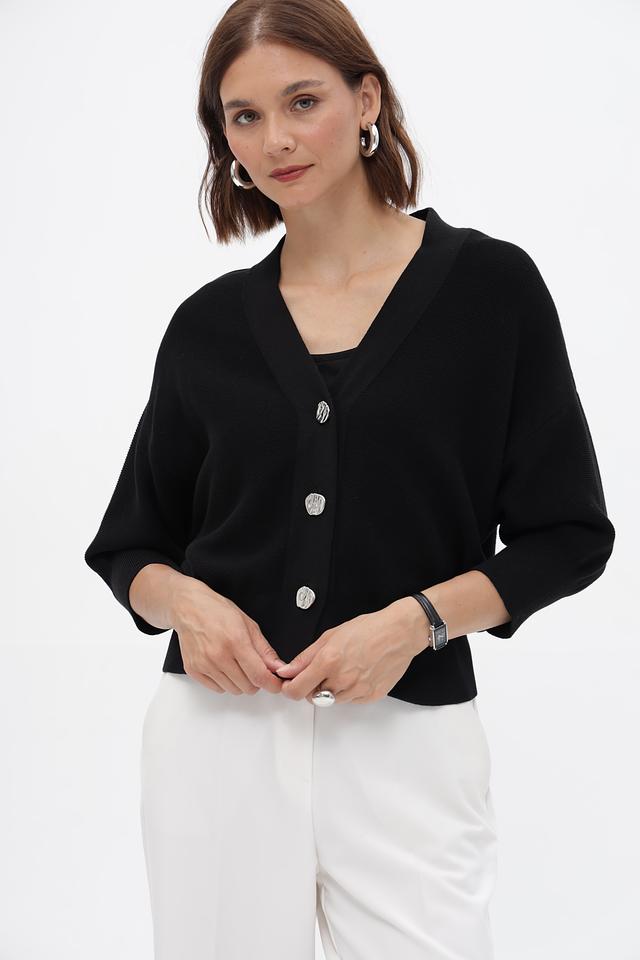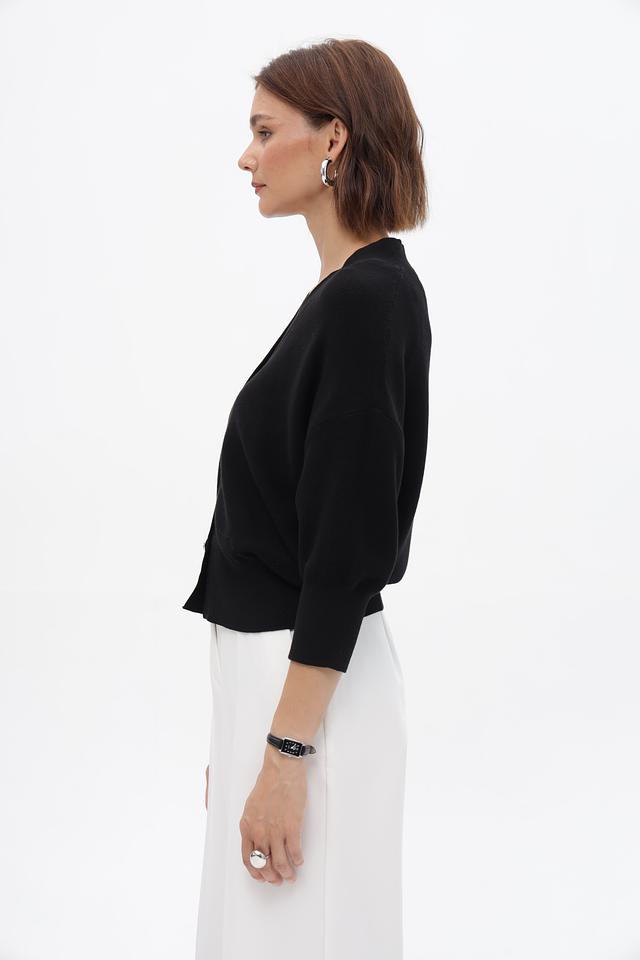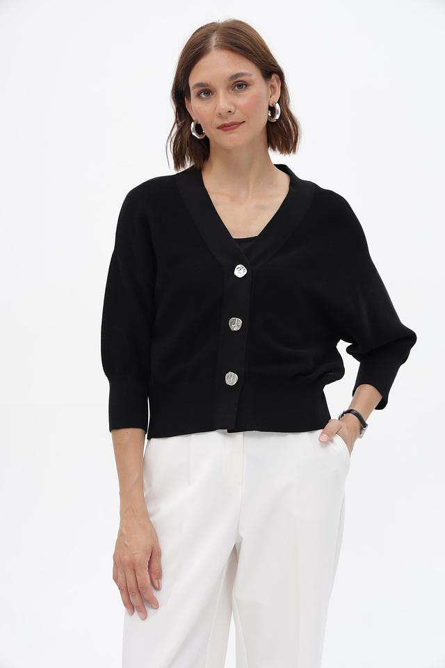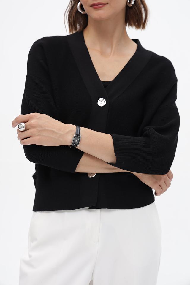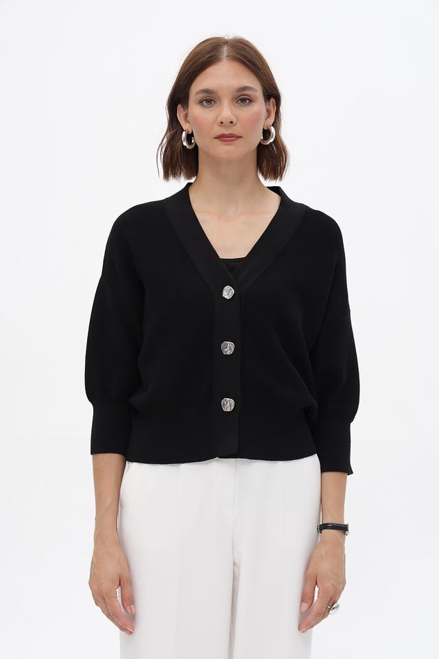 Жакет имеет V-образный вырез и застёжку на пуговицы. Пуговицы отличаются оригинальным дизайном, добавляя изделию изысканности. Рукава 3/4 с небольшим объёмом придают образу лёгкость и непринуждённость.