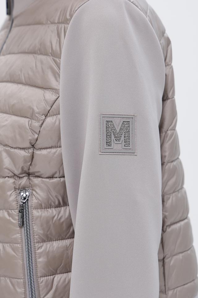 Рукава куртки выполнены из гладкой ткани серого цвета. Передняя часть и спинка – стеганы, что придает куртке стильный и современный вид. На левом рукаве расположен логотип бренда в виде буквы «M», декорированной стразами.