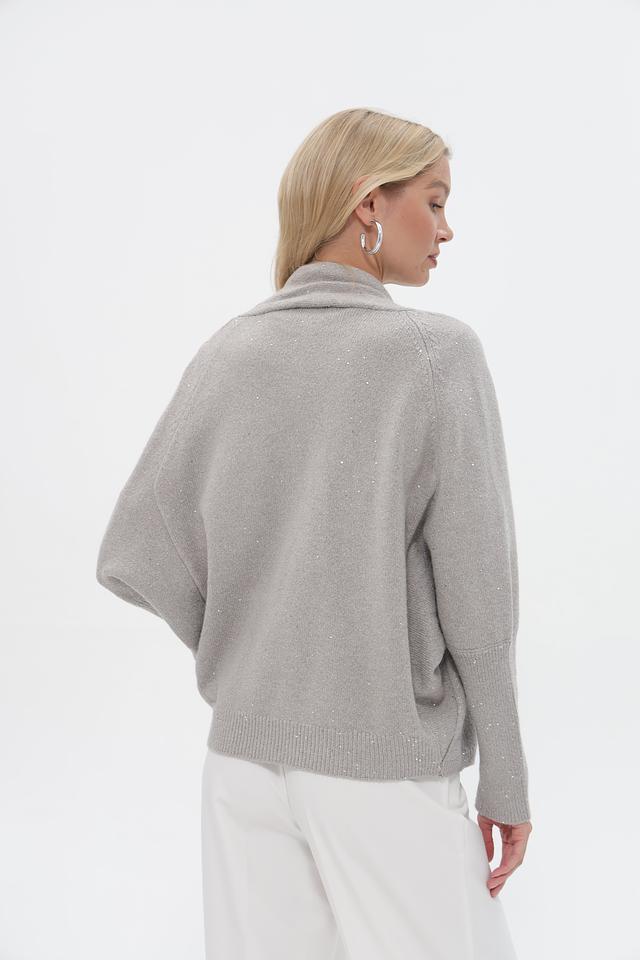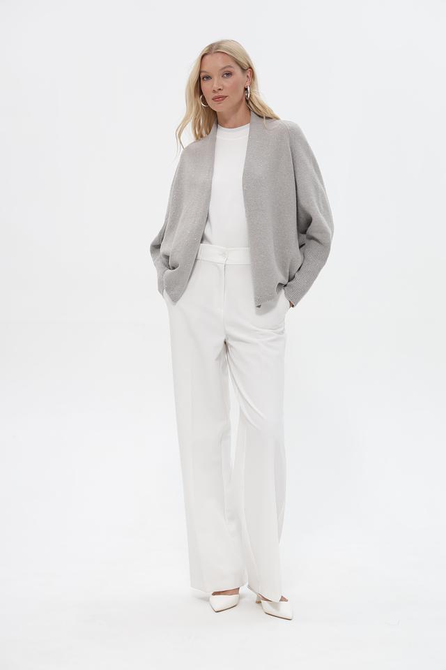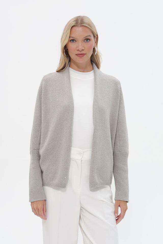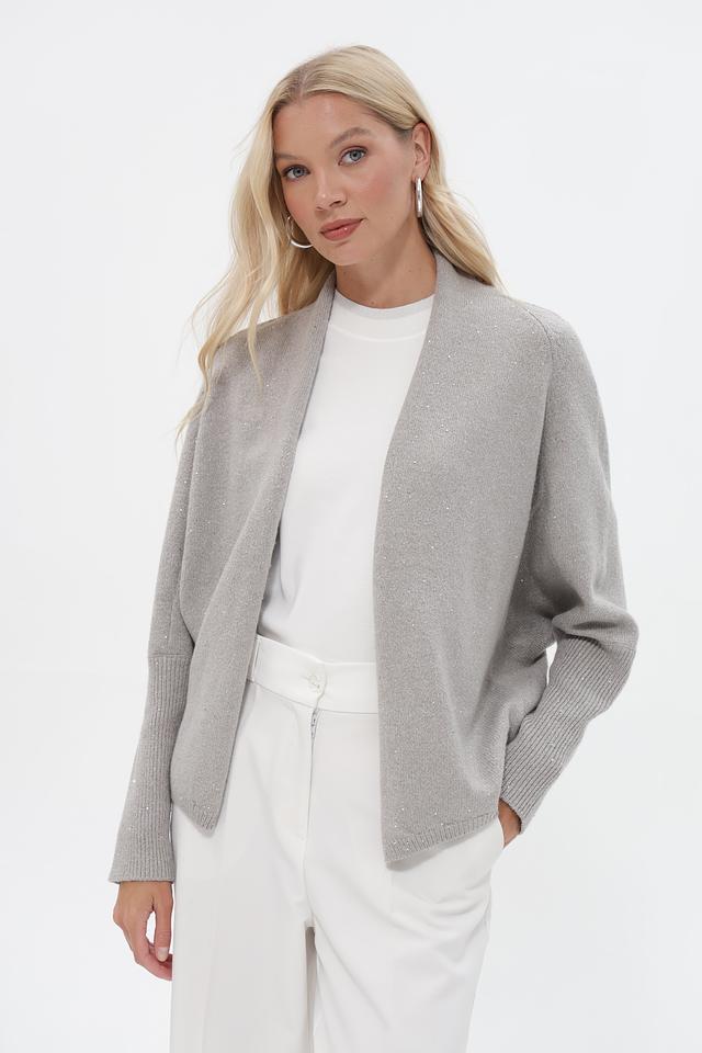 Жакет имеет свободный крой, длинные рукава и воротник-стойку. Отсутствие застежки позволяет легко создавать различные образы, а вязаный трикотаж обеспечивает комфорт в носке.