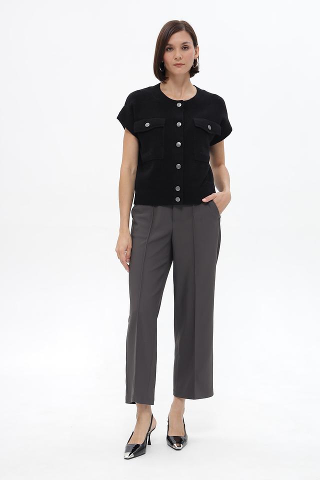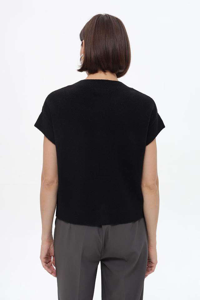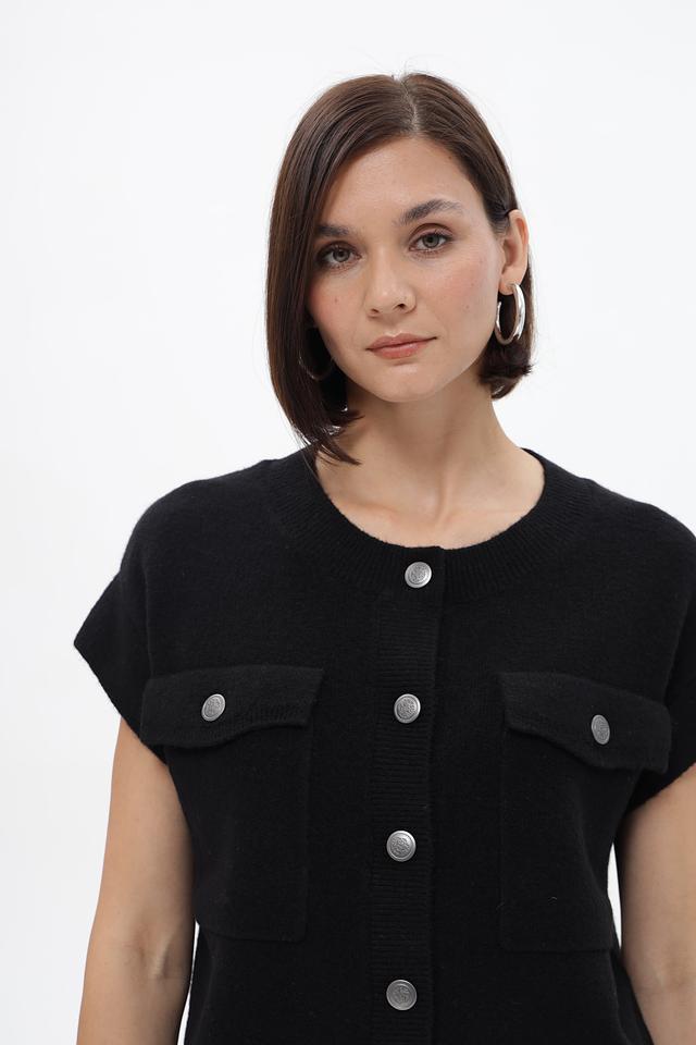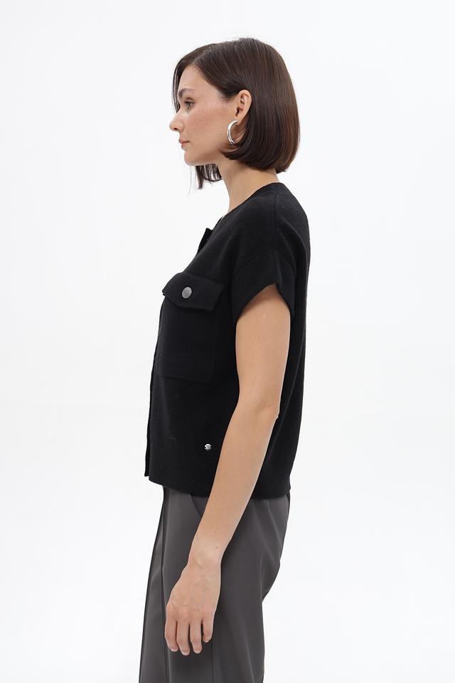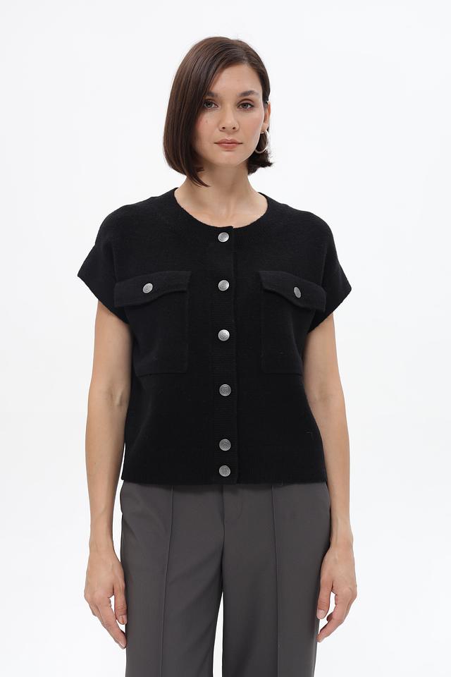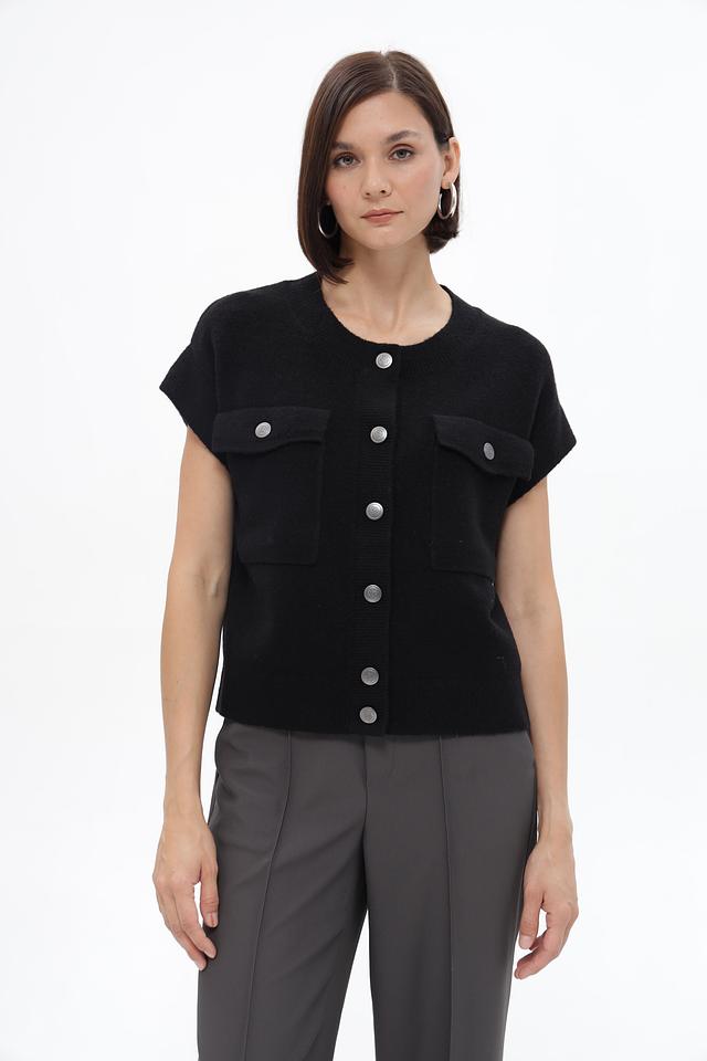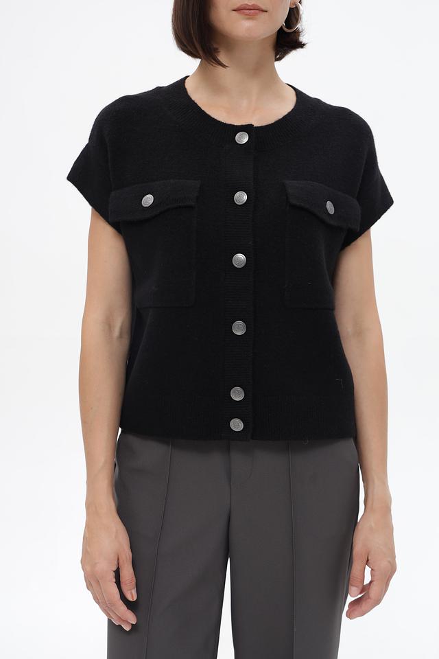 Чёрный жакет Monari из вязаного полотна с короткими рукавами и накладными карманами. Модель застёгивается на пуговицы и имеет прямой крой, который обеспечит комфортную посадку по фигуре. Состав: полиэстер 41%, полиакрил 36%, вискоза 10%, шерсть 10%, эластан 3%