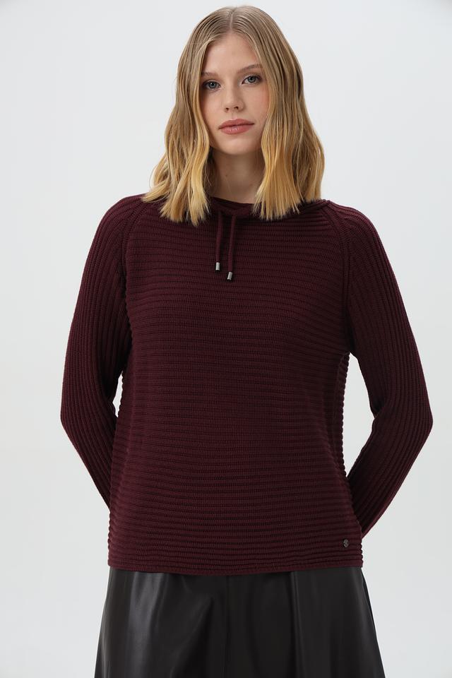 Бордовый пуловер Monari с капюшоном на шнурках станет отличным дополнением к вашему гардеробу. Изготовлен из мягкого и приятного на ощупь трикотажа с добавлением акрила. Комфортный крой и стильный дизайн. Состав: хлопок 50%, полиакрил 50%