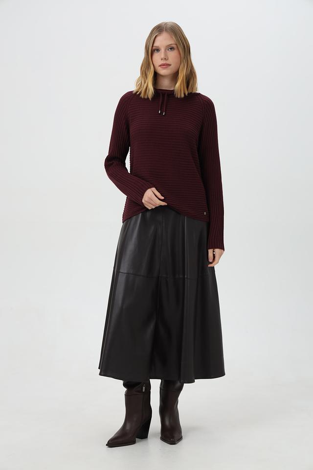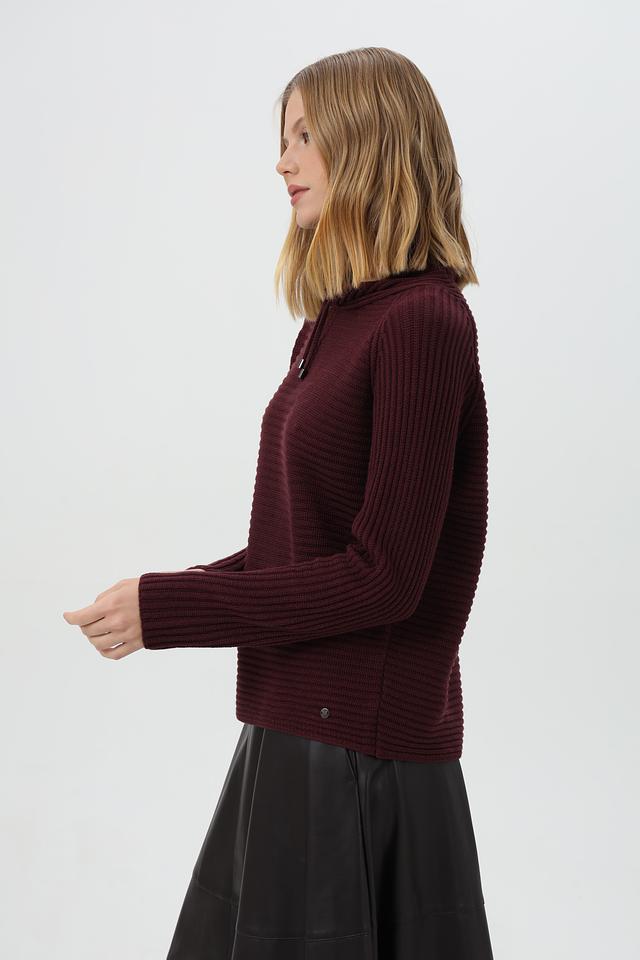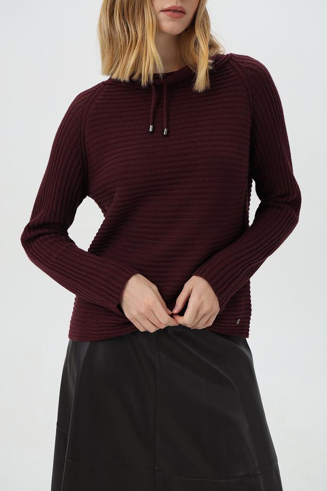 Элегантный бордовый пуловер от бренда Monari, выполнен из качественного трикотажа. Модель имеет удобный капюшон на шнурках, который добавляет образу непринужденности.