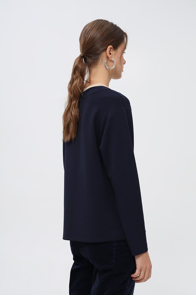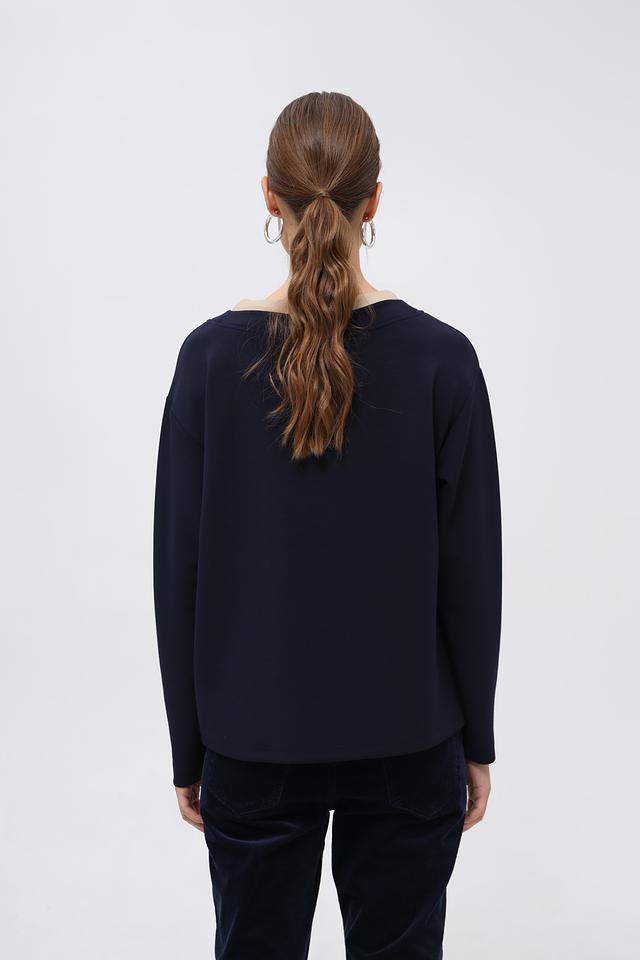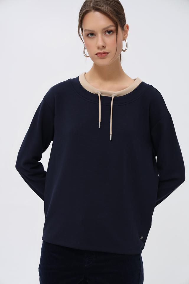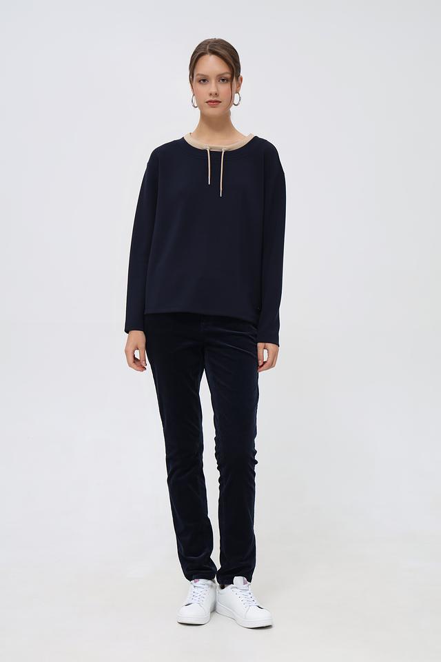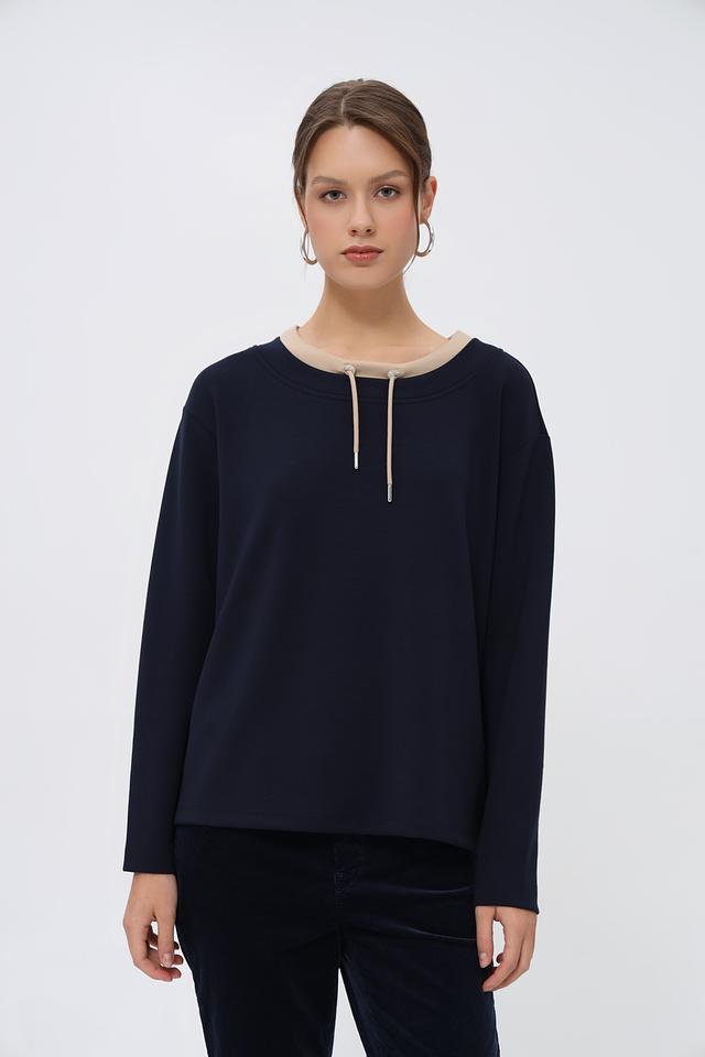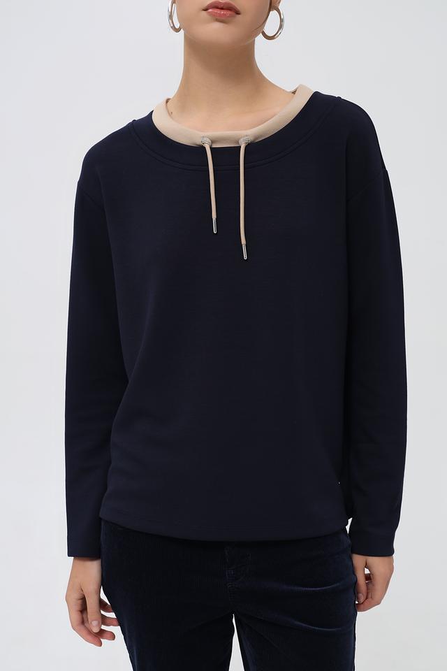 Тёмно-синий пуловер от Monari с контрастной бежевой горловиной и декоративной кулиской. Изготовлен из мягкого и комфортного трикотажа, в составе модал, полиэстер и эластан. Состав: модал 52%, полиэстер 42%, эластан 6%