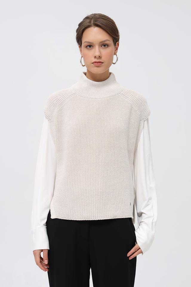 Этот бежевый вязаный жилет от Monari станет отличным выбором для создания многослойных образов. Он имеет удобный высокий воротник и свободный крой, который не сковывает движения.