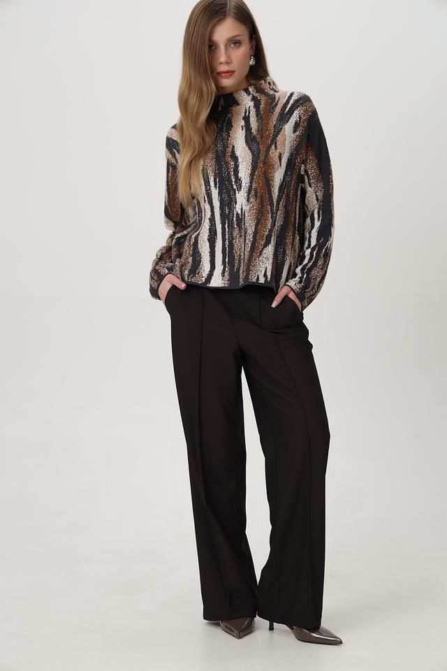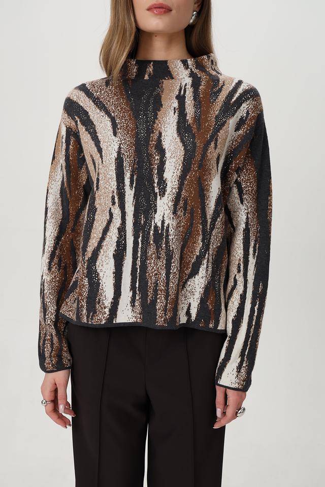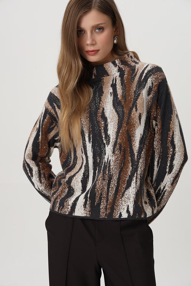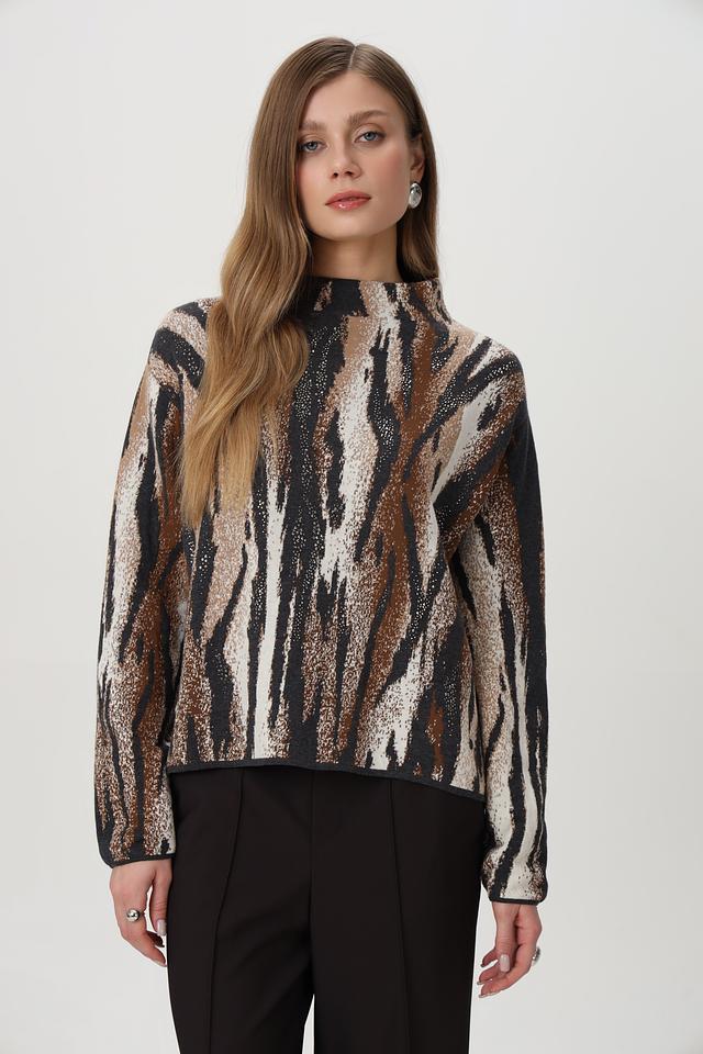 Элегантный пуловер от бренда Monari, выполненный в коричневой цветовой гамме с эффектным принтом. Модель имеет длинные рукава и высокий воротник, что делает её подходящей для прохладной погоды.