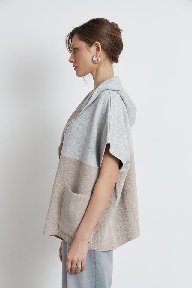 Жилет имеет свободный крой и короткие рукава, а также капюшон, который добавляет образу непринужденности. На передней части расположены два накладных кармана, которые не только функциональны, но и служат декоративным элементом.