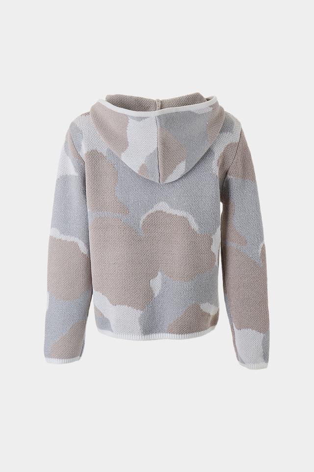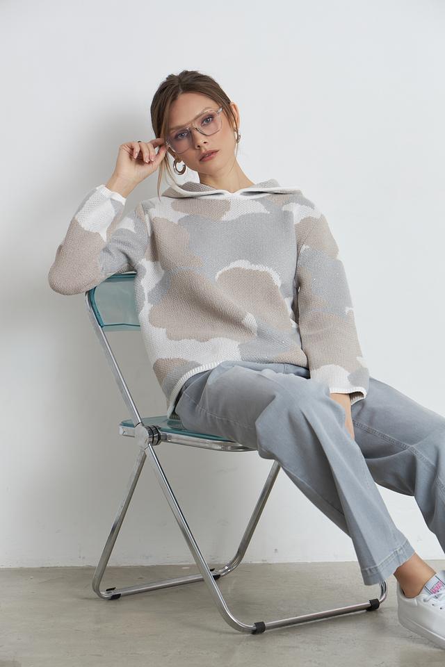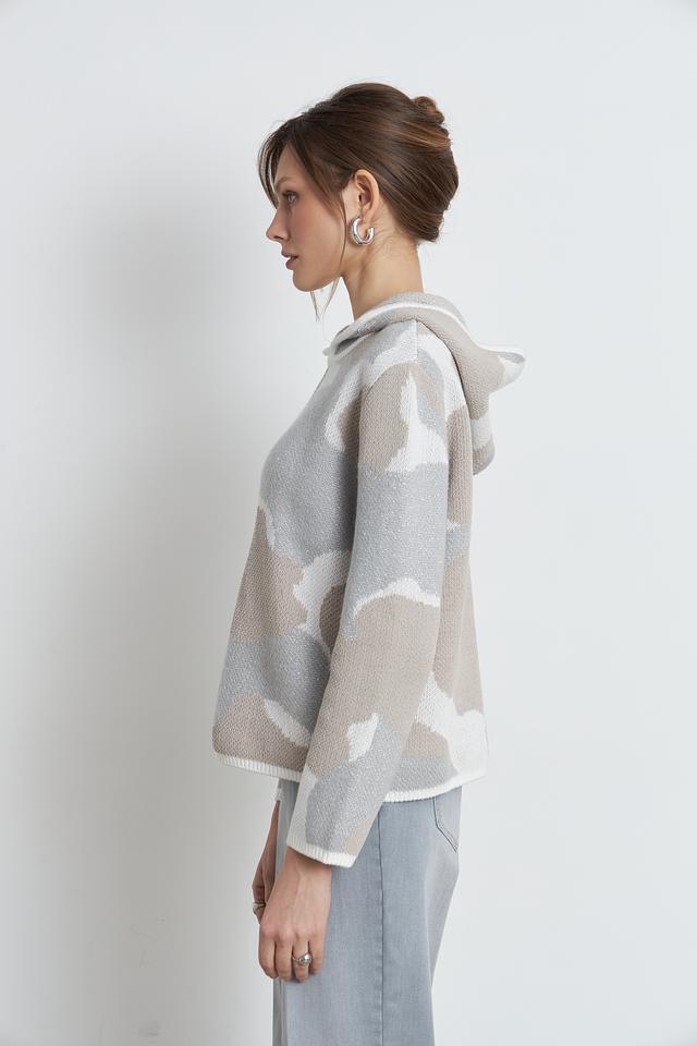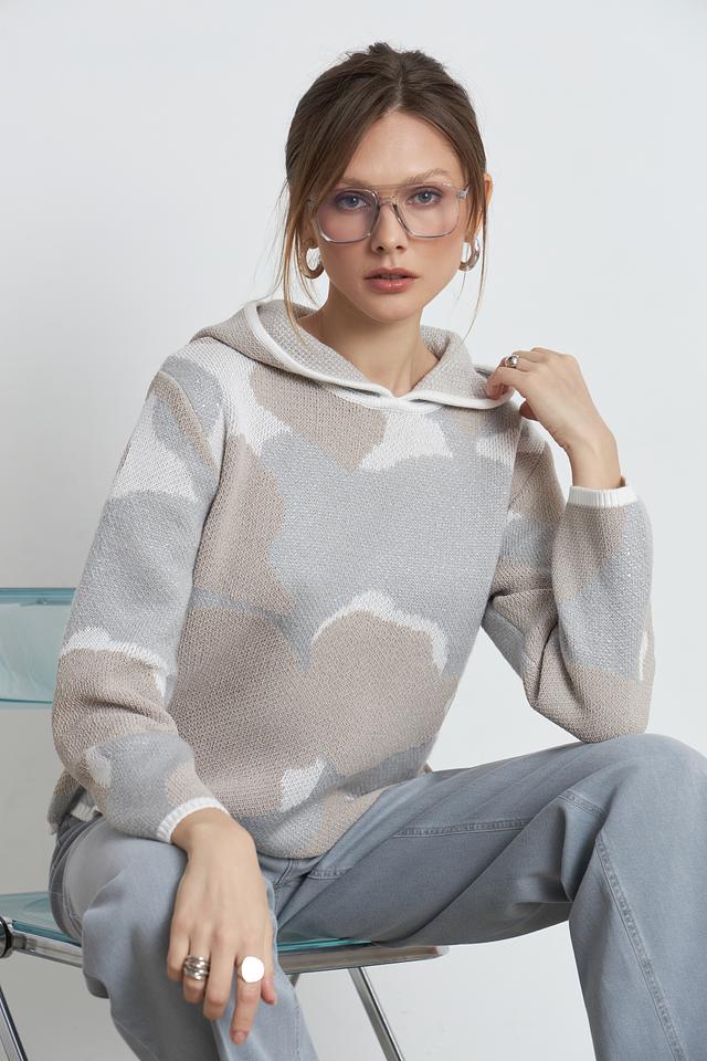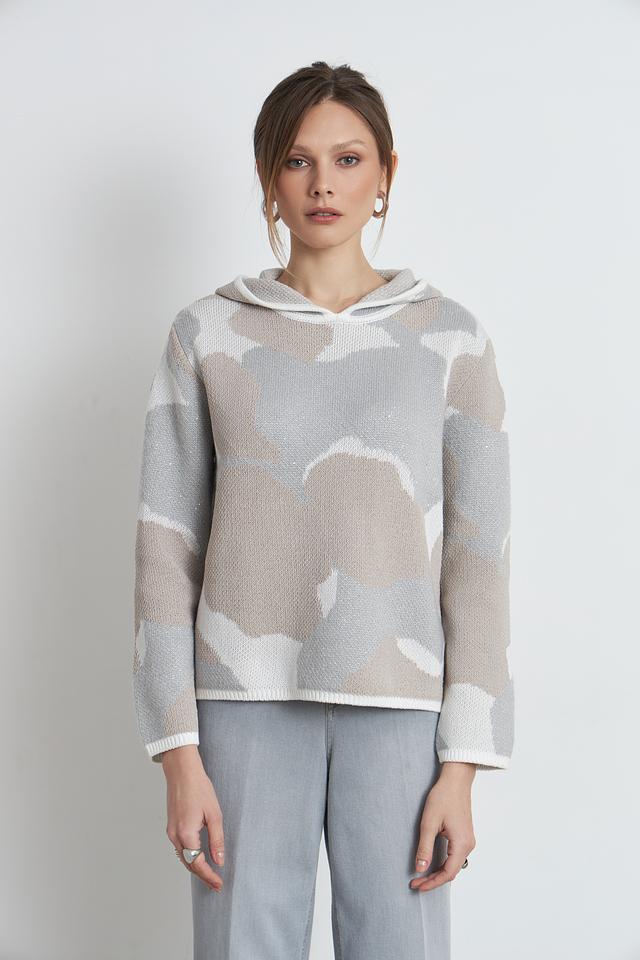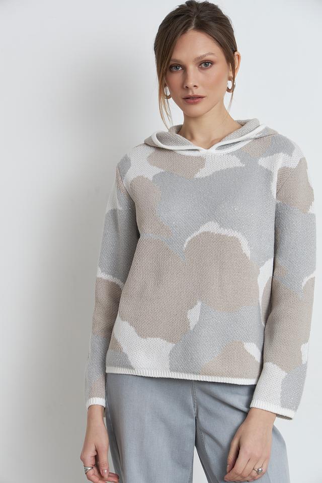 Этот стильный пуловер от Monari выполнен в бежевой цветовой гамме и украшен необычным принтом, напоминающим облака. Модель имеет удобный капюшон, который добавляет образу непринужденности и практичности.