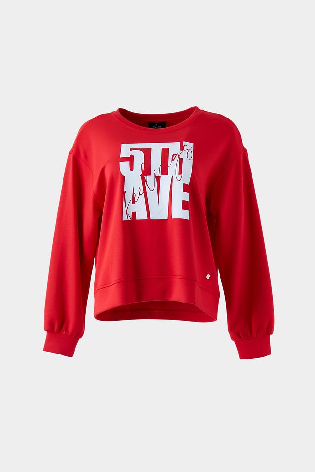 Этот стильный пуловер от Monari выполнен в насыщенном красном цвете и украшен крупным белым принтом с надписью "Feel the wave". Модель имеет свободный крой, который обеспечивает комфорт и свободу движений.