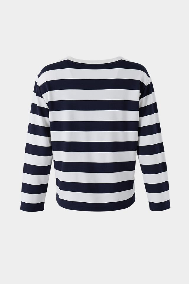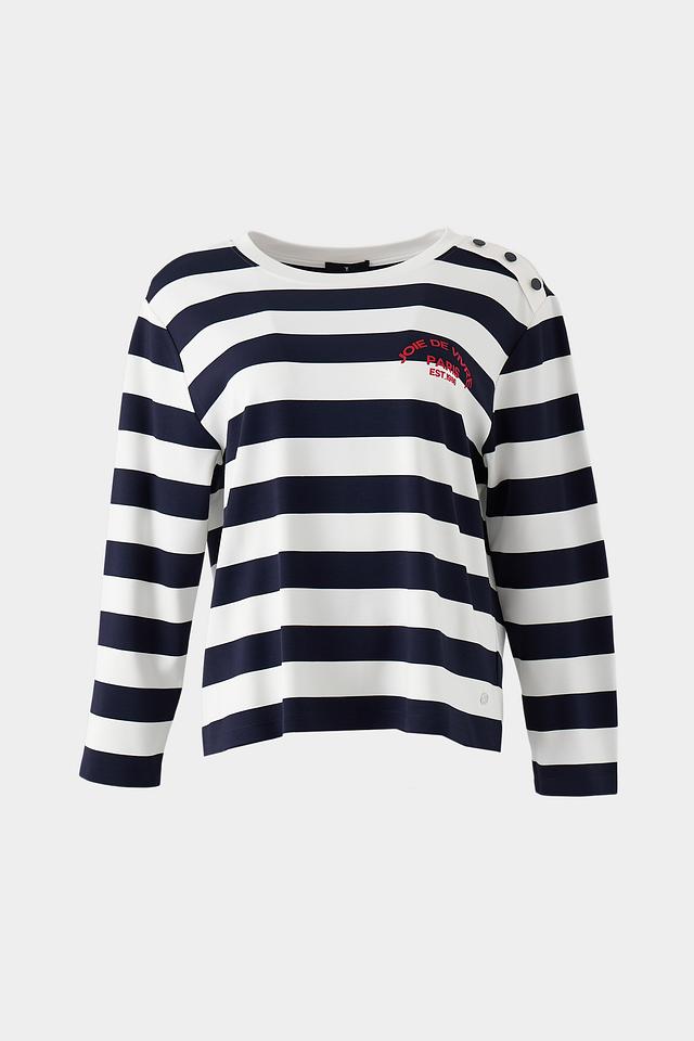 Женский пуловер Monari сине-белого цвета в классическую полоску. Модель с круглым вырезом и декоративными пуговицами на плечах, украшенной вышивкой "Joie de Vivre". Состав: вискоза 83%, полиэстер 14%, эластан 3%