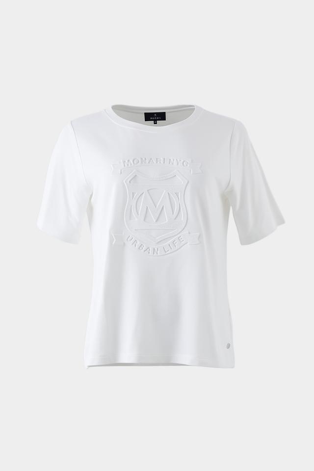 Белая футболка Monari с рельефным логотипом на груди. Изготовлена из мягкой вискозы с добавлением модала и эластана для комфорта и хорошей посадки. Состав: вискоза 70%, модал 25%, эластан 5%