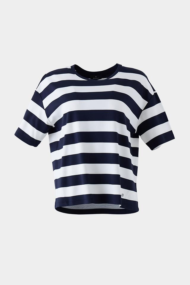 Женская футболка Monari синего и белого цвета с классическим полосатым дизайном. Изготовлена из мягкой вискозы с добавлением полиэстера и эластана для комфорта и хорошей посадки. Состав: вискоза 83%, полиэстер 14%, эластан 3%