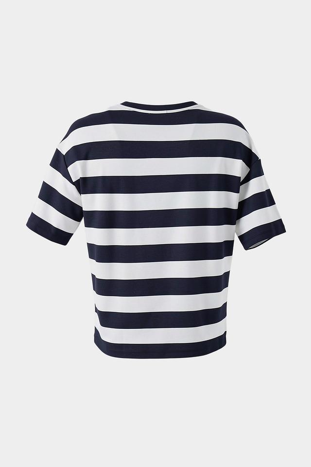 Дизайн футболки представлен в виде горизонтальных полос, что визуально вытягивает силуэт. Короткие рукава и округлый вырез горловины обеспечивают свободу движений и комфорт в жаркую погоду. Состав: вискоза 83%, полиэстер 14%, эластан 3%.