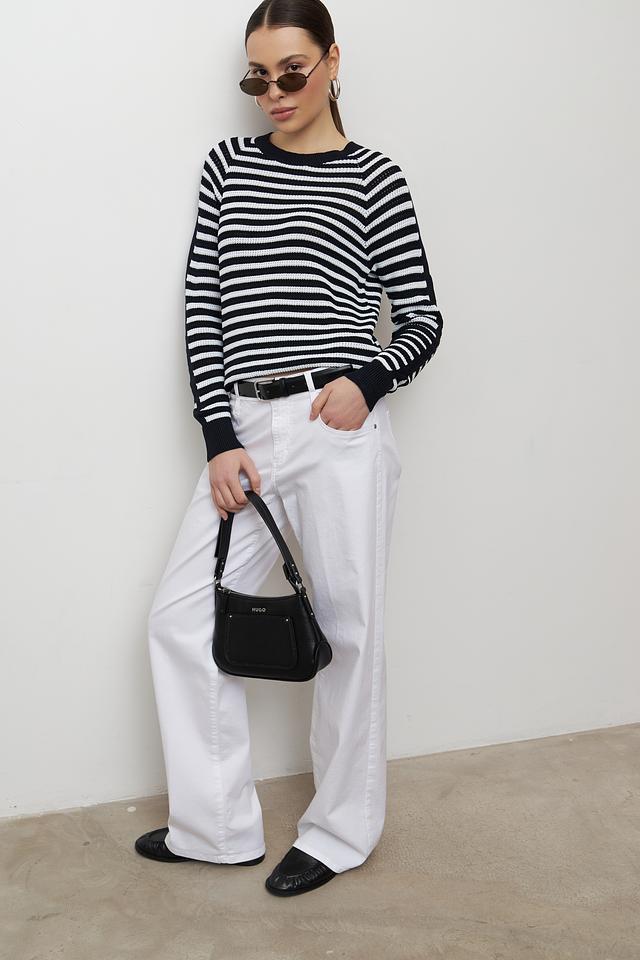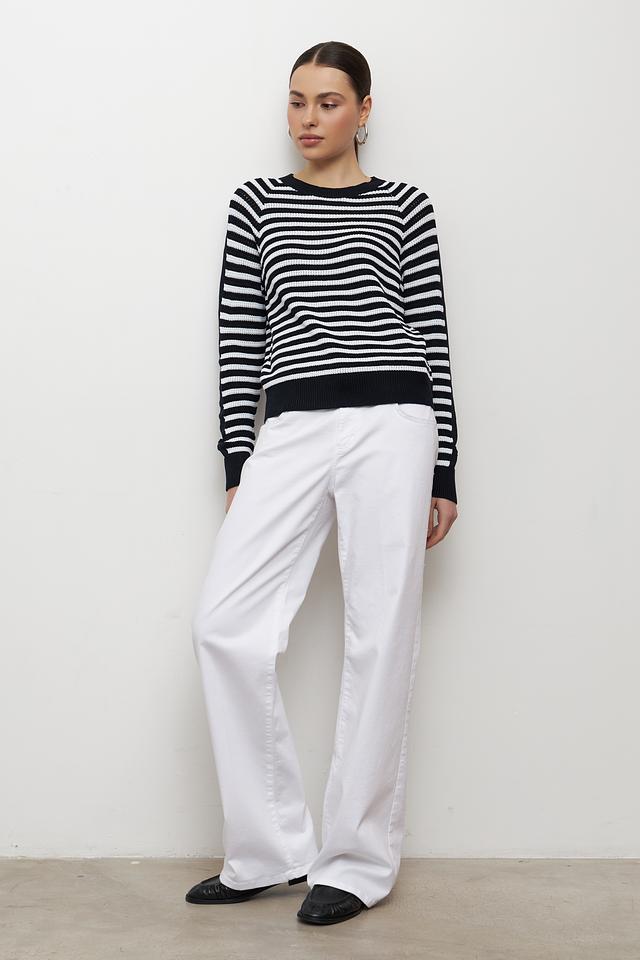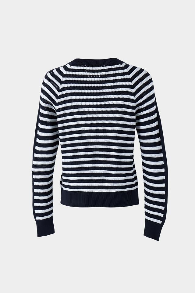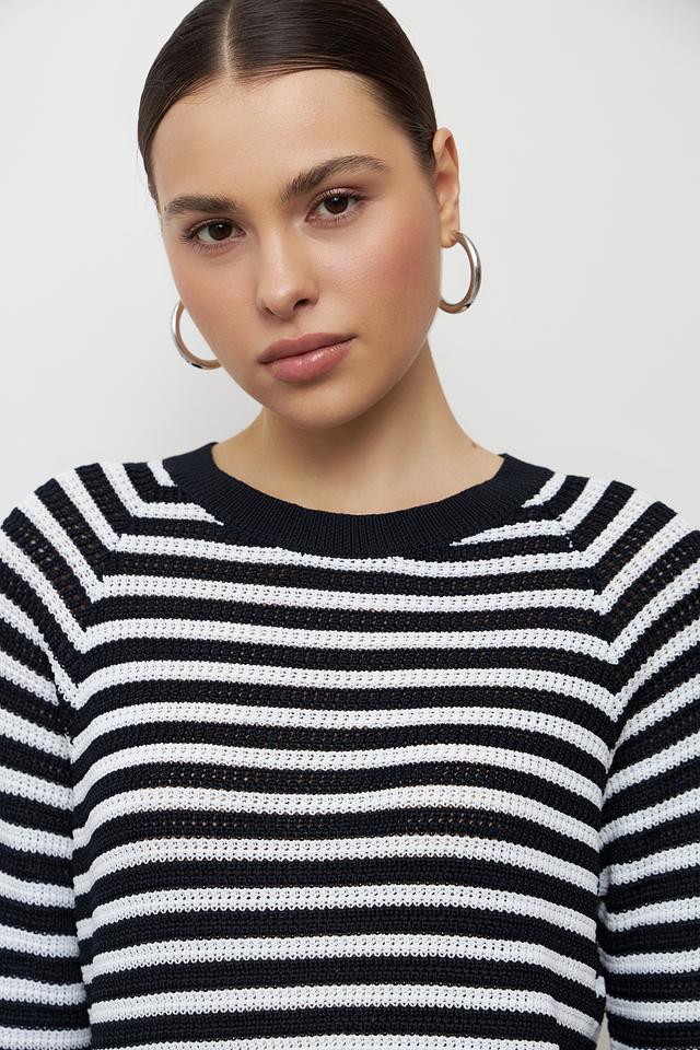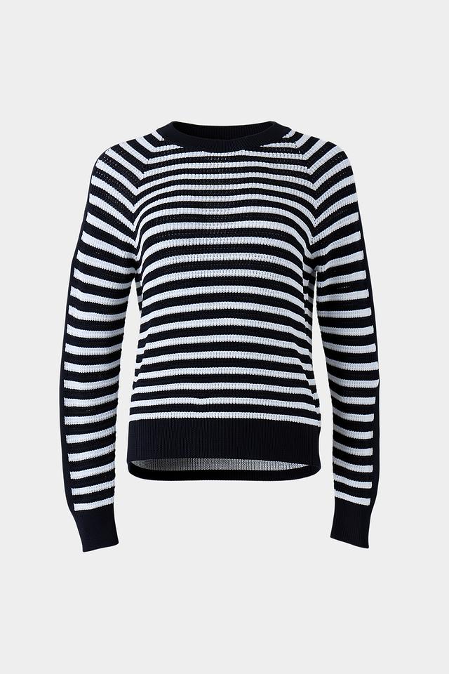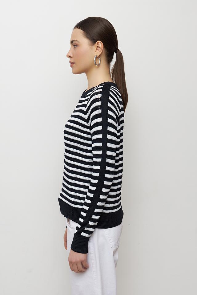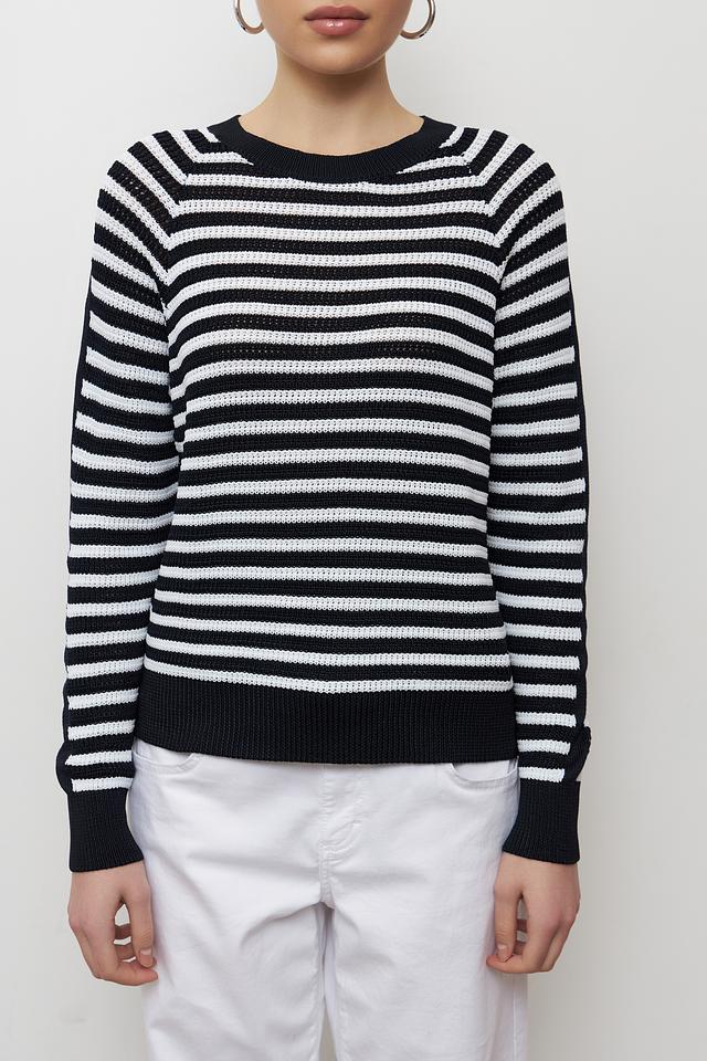 Этот стильный пуловер от Monari станет отличным дополнением к вашему гардеробу. Пуловер выполнен в классической полосатой расцветке – сочетание чёрного и белого цветов делает его универсальным и легко сочетаемым с другими вещами.