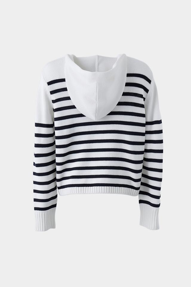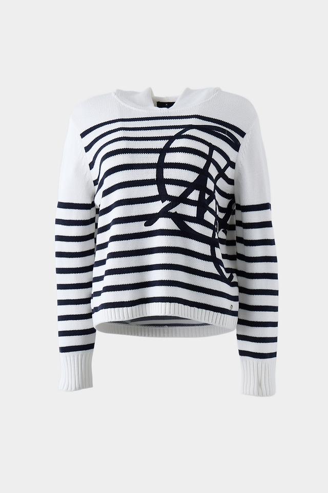 Женский пуловер Monari белого и тёмно-синего цвета, выполненный в полоску с оригинальным графическим принтом и капюшоном. Модель имеет удобный крой и выполнена из мягкого хлопкового трикотажа. Состав: хлопок 60%, полиакрил 40%