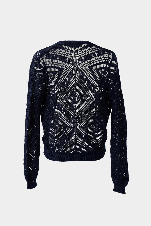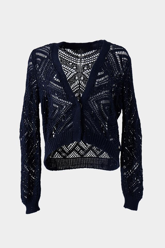 Тёмно-синий жакет Monari из вязаного полотна с ажурными рукавами. Модель имеет V-образный вырез и свободный крой, идеально подходит для создания стильных повседневных образов. Состав: хлопок 60%, полиэстер 40%