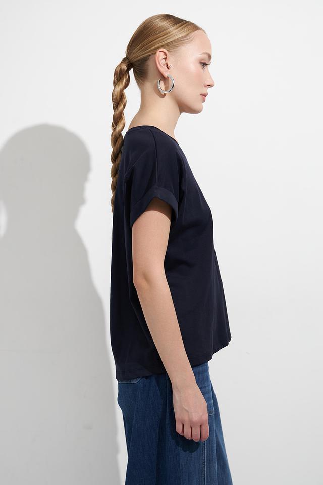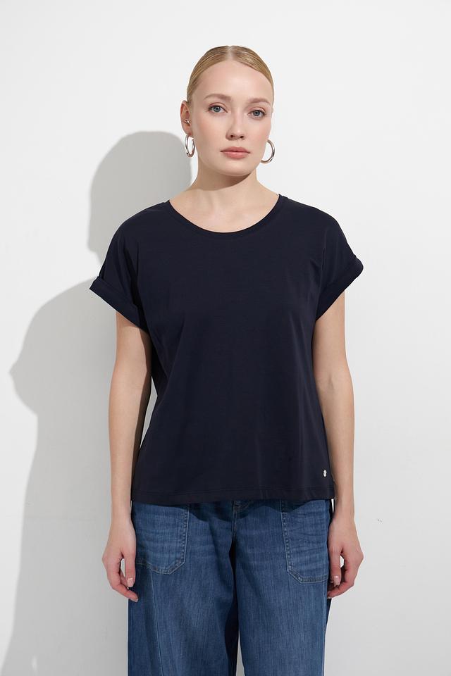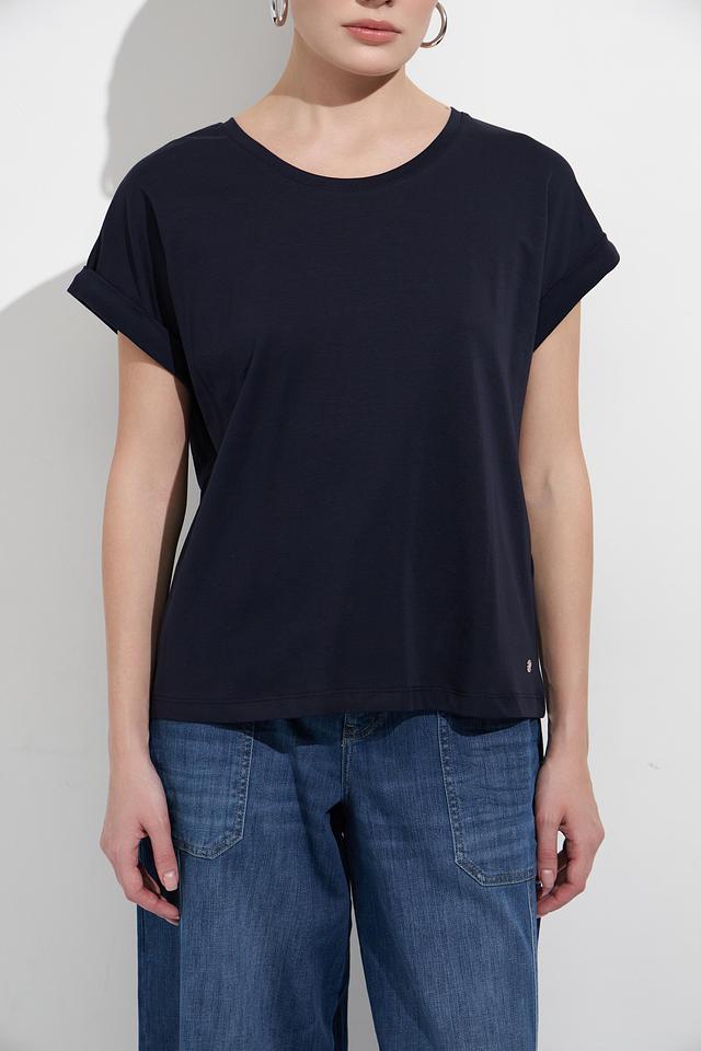 Женская футболка Monari черного цвета с оригинальным декором по горловине и рукавам. Изготовлена из 100% хлопка, обеспечивающего комфорт и воздухопроницаемость. Стильный и удобный вариант для повседневного образа. Состав: хлопок 100%