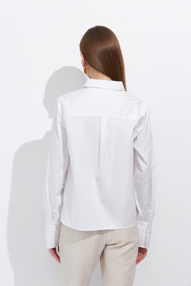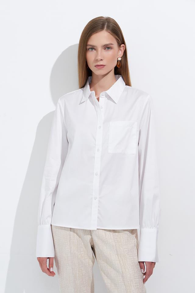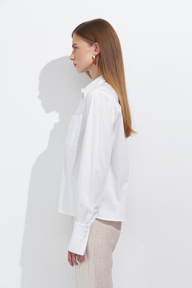 Блуза имеет прямой крой, длинные рукава с манжетами на пуговицах и воротник классической формы. На груди расположен накладной карман, который добавляет блузе функциональности и стиля.