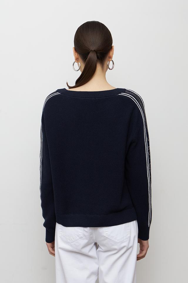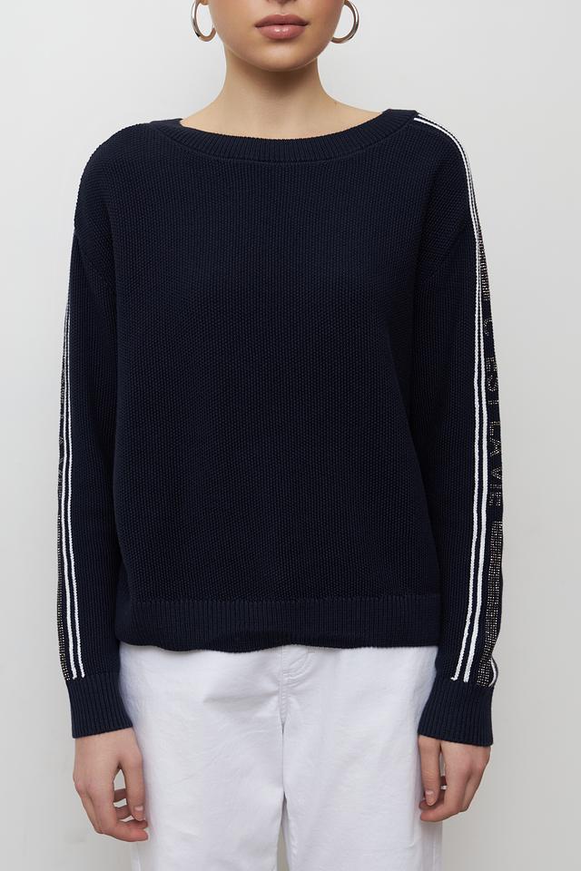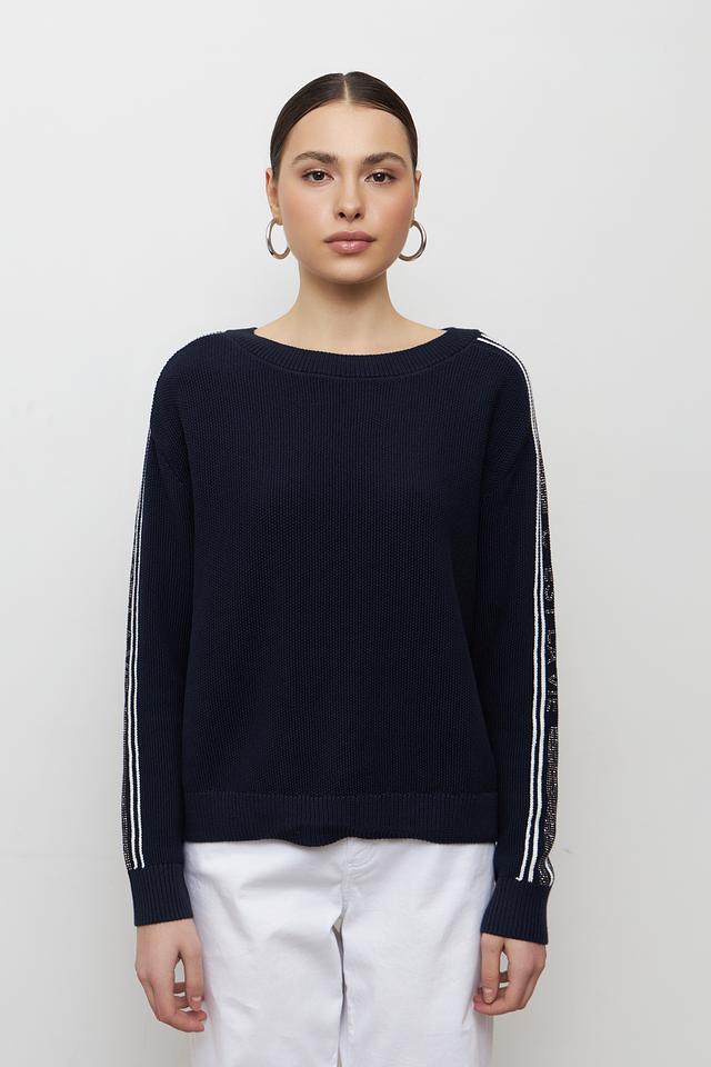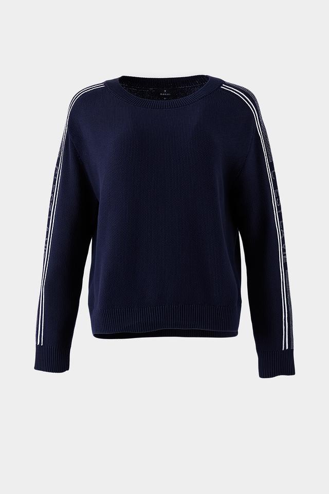 Стильный пуловер Monari темно-синего цвета с контрастными белыми полосками на рукавах. Изготовлен из мягкого хлопка, обеспечивающего комфорт в носке. Идеально дополнит повседневный гардероб. Состав: хлопок 100%