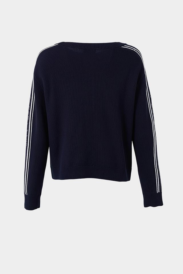 Пуловер имеет прямой крой и круглый вырез горловины. Белые полоски на рукавах придают модели динамичный и современный вид. Изготовлен из 100% хлопка, что обеспечивает мягкость, приятные тактильные ощущения и комфорт при носке.