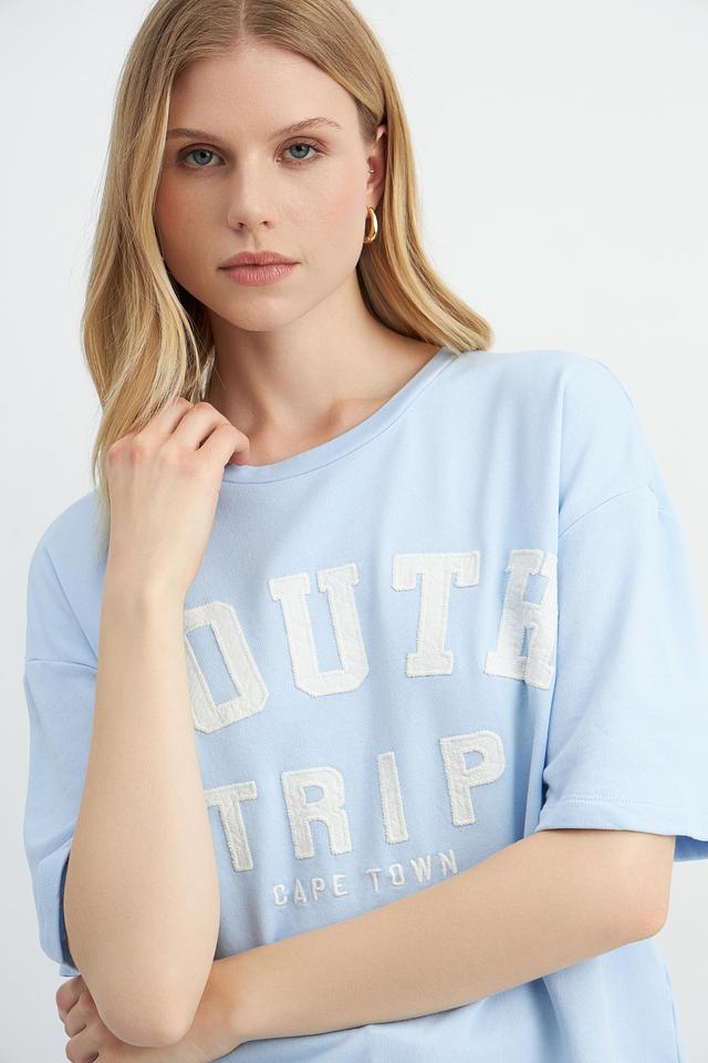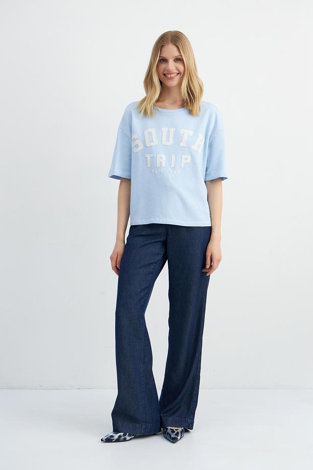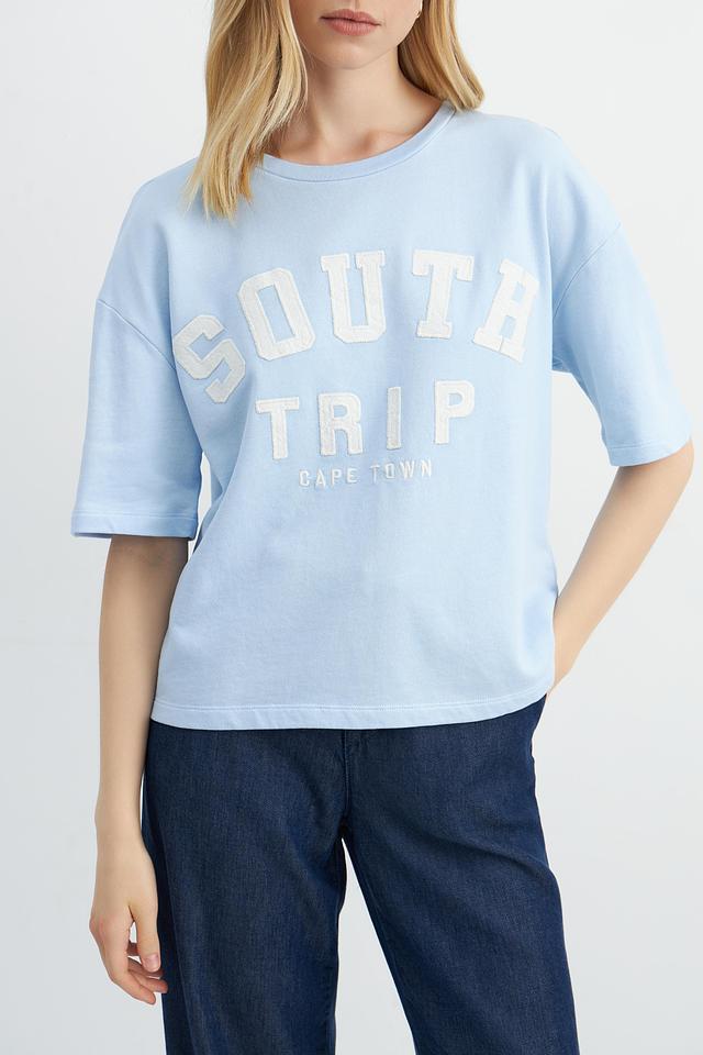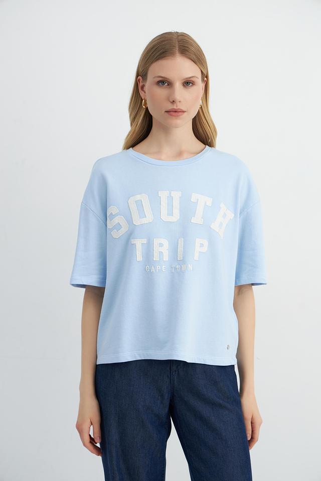Эта стильная футболка от Monari выполнена в нежном светло-голубом цвете и украшена крупным принтом "South Trip Cape Town". Модель имеет свободный крой, который обеспечивает комфортную посадку по фигуре.